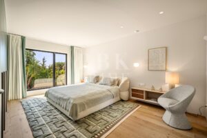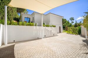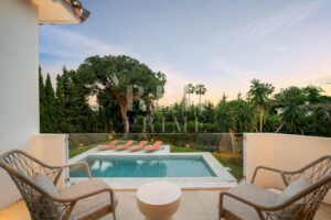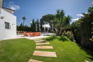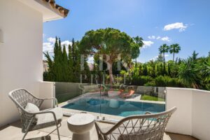 Elegante Villa im mediterranen Stil zum Verkauf in Nueva Andalucía, Málaga. Das Anwesen befindet sich auf einem 1.006 m² großen Grundstück, umgeben von Vegetation, Bäumen und gepflegten Gärten. Dank seiner Südostausrichtung genießt es den ganzen Tag über reichlich Tageslicht. Die Immobilie hat eine bebaute Fläche von 262 m², verteilt auf 2 Etagen, und wurde so konzipiert, dass sie Komfort und Eleganz bietet. Das Erdgeschoss umfasst ein Schlafzimmer, ein komplettes Badezimmer und eine offene Küche, die zum Esszimmer hin offen ist. Das Obergeschoss umfasst 3 geräumige Suiten, jeweils mit Einbauschränken, sowie ein Wohnzimmer, das sich ideal für Familienfeiern eignet. Das Interieur kombiniert zeitgenössisches Design mit warmen Holzoberflächen und hochwertigen Materialien. Große Fenster rahmen den Blick auf den Berg La Concha ein und verstärken die Verbindung zwischen Innen und Außen. Die Villa verfügt außerdem über einen Swimmingpool, Gärten, ein Solarium, einen Entspannungsbereich und einen überdachten Parkplatz für zwei Fahrzeuge. Nur wenige Minuten von Puerto Banús, Golfplätzen, Restaurants und allen Annehmlichkeiten entfernt, bietet diese Immobilie eine unschlagbare Gelegenheit, den mediterranen Lebensstil in einer exklusiven und gut angebundenen Lage zu genießen.