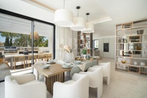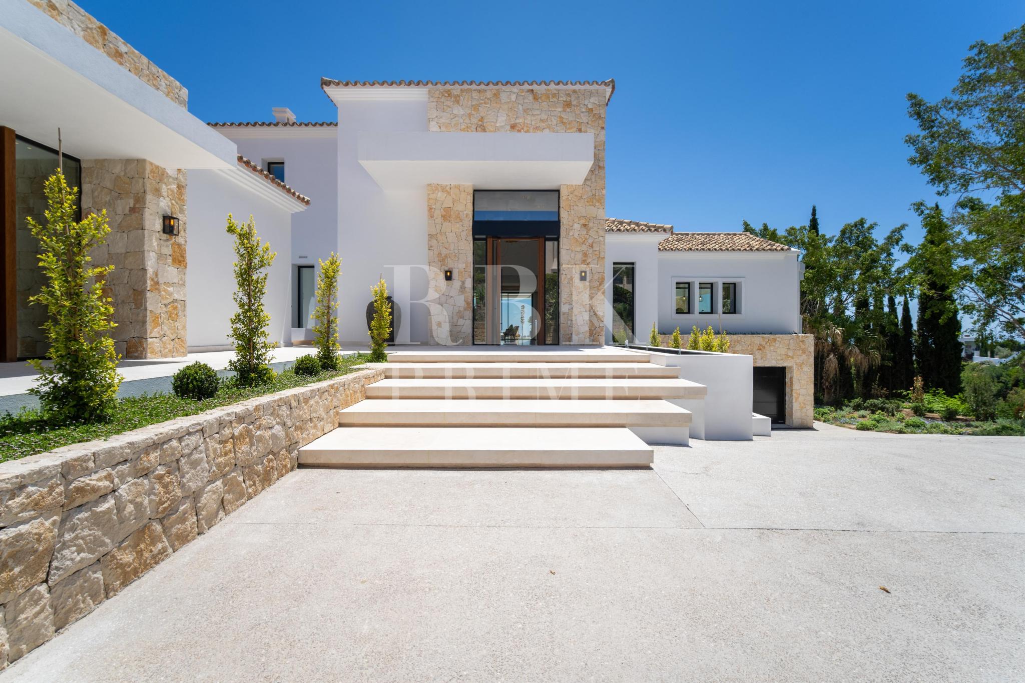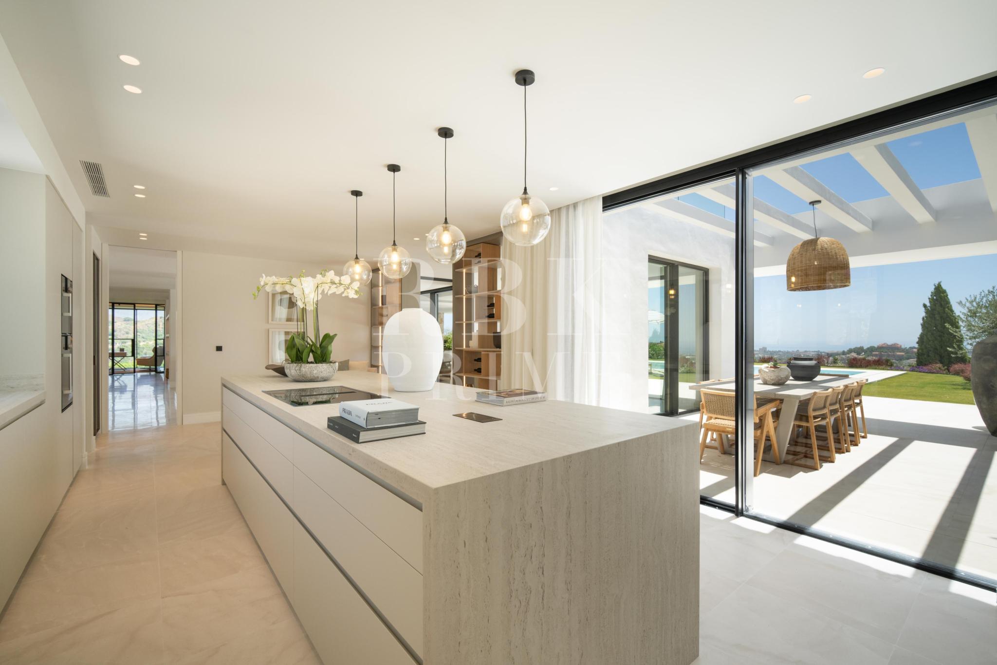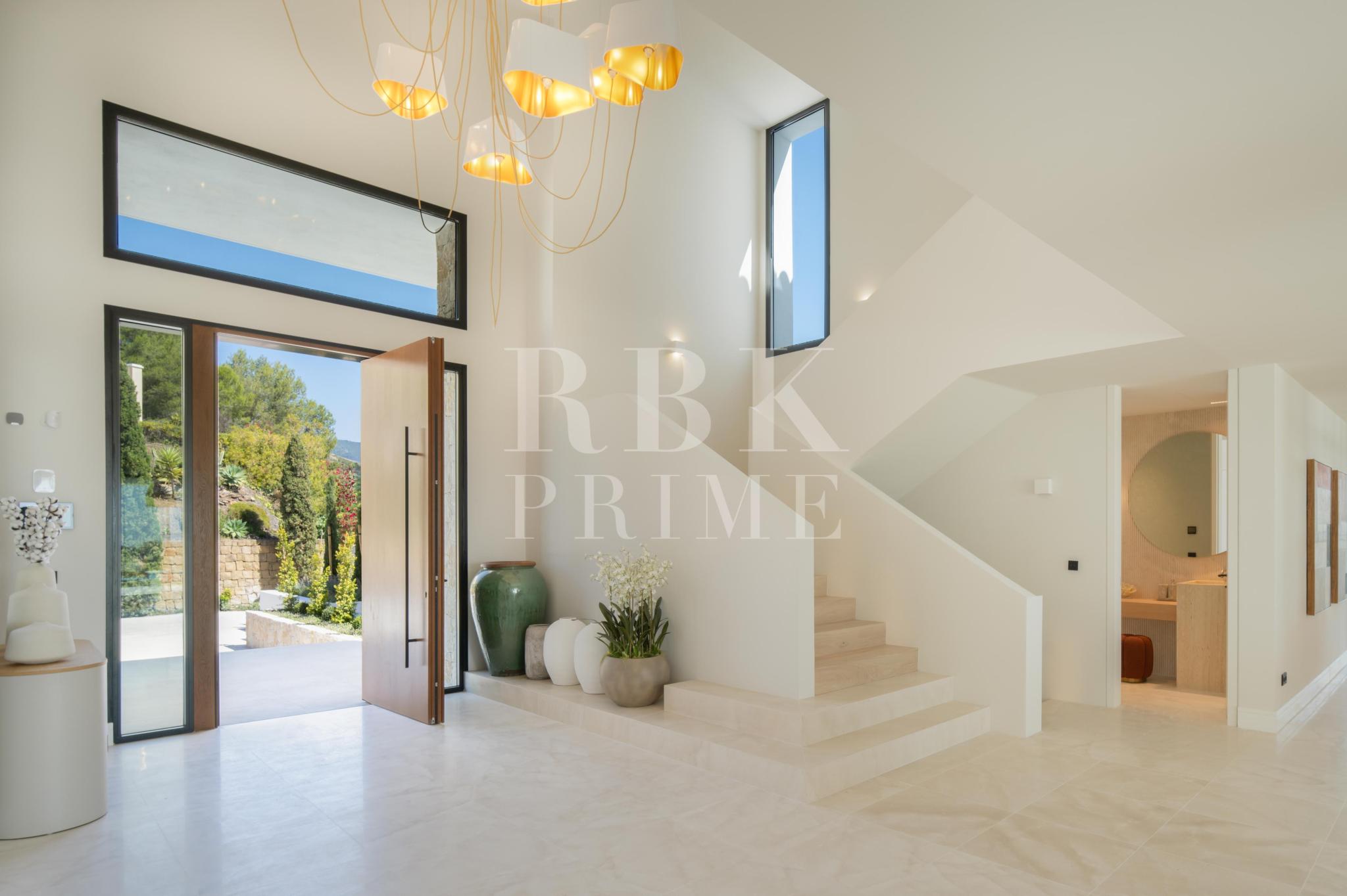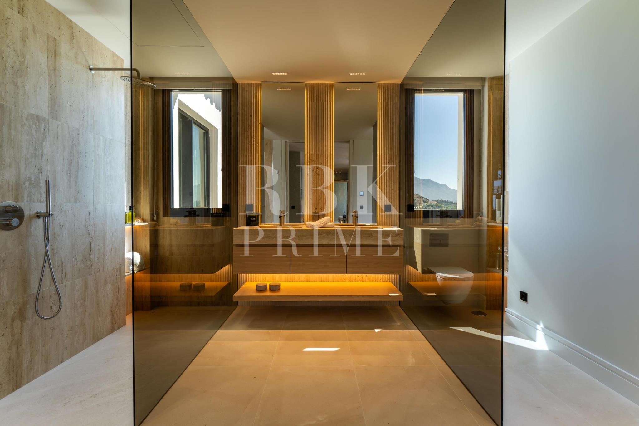 Exklusive Neubauimmobilie zum Verkauf in Benahavís, Malaga. Entworfen von dem renommierten Studio GC Studios und auf einem erhöhten Grundstück von etwa 3630 m2 mit spektakulären Landschaften gelegen, verbindet diese Villa die Eleganz der Französisch provenzalischen Stil mit mediterranem Charme, mit natürlichen Materialien und traditionellen Dachziegeln. Sie verfügt über 8 geräumige Schlafzimmer, darunter ein Hauptschlafzimmer mit privater Terrasse und Panoramablick auf das Meer, die alle für maximalen Komfort ausgelegt sind. Die offene Küche mit zentraler Insel und viel Stauraum ist mit dem Wohn- und Esszimmer zu einem gemütlichen und funktionalen Raum verbunden. Die Innenräume zeichnen sich durch ihre Raffinesse aus, mit hochwertigen Möbeln, viel natürlichem Licht dank der bodentiefen Fenster und einem Grundriss, der auf modernes Wohnen ausgelegt ist. Der Außenbereich bietet einen privaten Swimmingpool, gepflegte Gärten und mehrere Chill-out-Bereiche, die zum Entspannen einladen. Zu den exklusiven Annehmlichkeiten gehören auch ein Fitnessraum, ein Kinosaal und ein luxuriöses SPA mit Sauna und Innenpool.