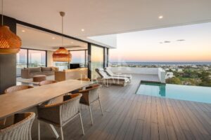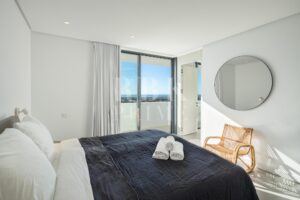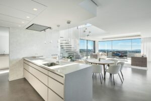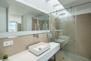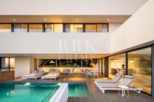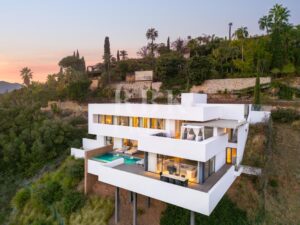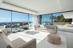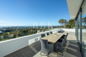 Moderne Villa zum Verkauf in einer bewachten Wohnanlage in Benahavís, Málaga. Auf einem 1.047 m² großen Grundstück in erhöhter Lage bietet die Immobilie von allen Ebenen aus Panoramablick auf das Meer, einschließlich der Küste von Gibraltar und Nordafrika. Mit einer bebauten Fläche von 380 m² erstreckt sich die Villa über zwei Etagen, verbunden durch einen Aufzug, und verfügt über 4 Suiten und eine Gästetoilette. Der Innenbereich überzeugt mit offenem Grundriss, der Wohn-, Ess- und Küchenbereich verbindet. Die Küche ist mit modernen Geräten ausgestattet und bietet viel Stauraum. Große Schiebefenster lassen Tageslicht herein und führen direkt auf die Terrasse. Zur Ausstattung gehören ein Unterhaltungsraum mit Heimkino und zwei private Parkplätze. Im Außenbereich gibt es eine Terrasse mit Pool, Ruhebereich und Essplatz im Freien – ideal, um das Klima der Costa del Sol zu nutzen. Die Villa liegt in einer Anlage mit 24-Stunden-Sicherheitsdienst und bietet guten Zugang zu Golfplätzen, Puerto Banús, San Pedro und Marbella – eine attraktive Gelegenheit in bester Lage.