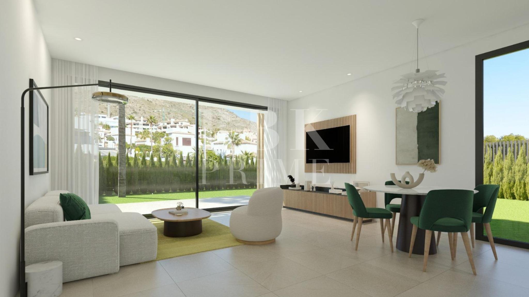 Exclusive new build villa for sale in Finestrat (Alicante), located in the prestigious Sierra Cortina area, in a privileged setting just minutes from Benidorm and the best beaches of the Costa Blanca. The development consists of villas and townhouses. The property has approximately 225 m² built and is distributed over 3 bedrooms and 3 bathrooms. The villa features a high-end contemporary design with open-plan spaces, large windows and excellent natural light. It includes a spacious multifunctional basement ideal as a gym, leisure room or additional bedroom, as well as a private plot, garden, large terraces and a private pool, creating an exclusive and comfortable environment. It is delivered with high-quality finishes, pre-installation of air conditioning, fitted wardrobes, a kitchen equipped with Bosch appliances and a smart home system for controlling lighting, climate and security. Located in a gated and secure community, ideal as a luxury residence or investment. Delivery is scheduled for 2028. Images are renders and information corresponds to the developer’s design.