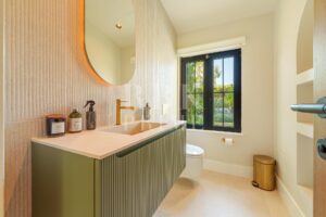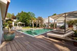 Exceptional single-story villa for sale, located in Marbella (Malaga), just minutes from the lively Puerto Banús. It offers modern and sophisticated living, with a seamless transition between indoor and outdoor spaces. With a surface area of 336 m² and total privacy, the villa has 5 spacious bedrooms, including a master suite that opens directly onto the pool terrace and features a luxurious bathroom with a bathtub. The interior is open plan with an impressive double-height ceiling in the entrance hall, floor-to-ceiling windows, and a geometric line on the ceiling that adds architectural charm. The fully equipped kitchen is integrated with the dining and living rooms, which have a fireplace. Outside there is a garden and a pool with a Jacuzzi, surrounded by wooden decking. The main terrace has a dining area with BBQ for relaxation and socializing, as well as an outdoor area ideal for enjoying the Costa del Sol climate year-round. This is a unique opportunity to acquire a turnkey villa that combines privacy, design, and an excellent coastal location.