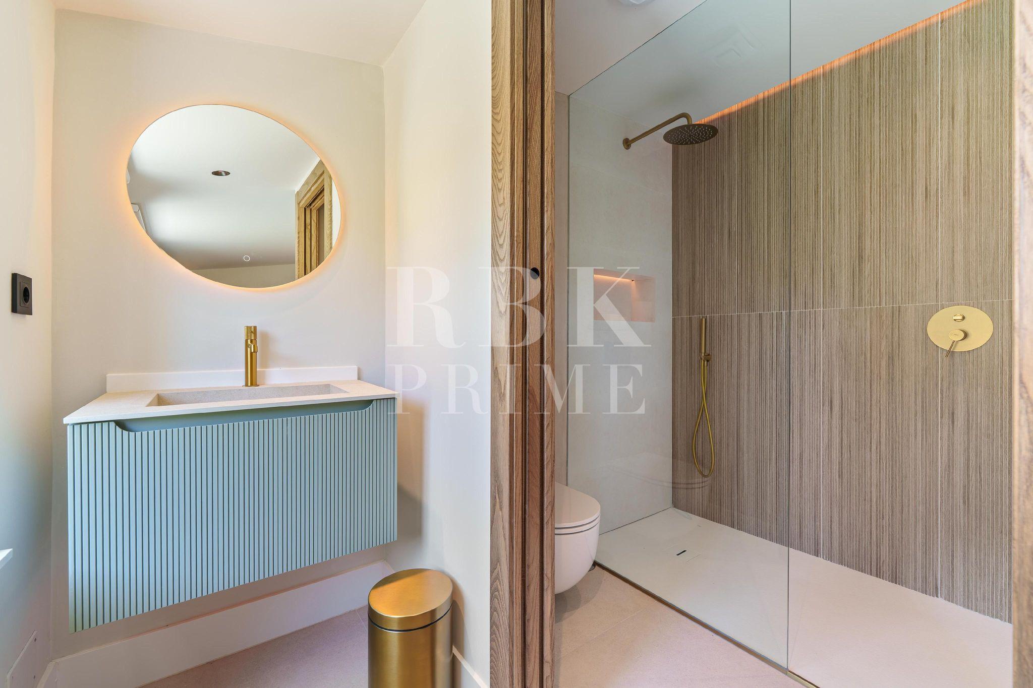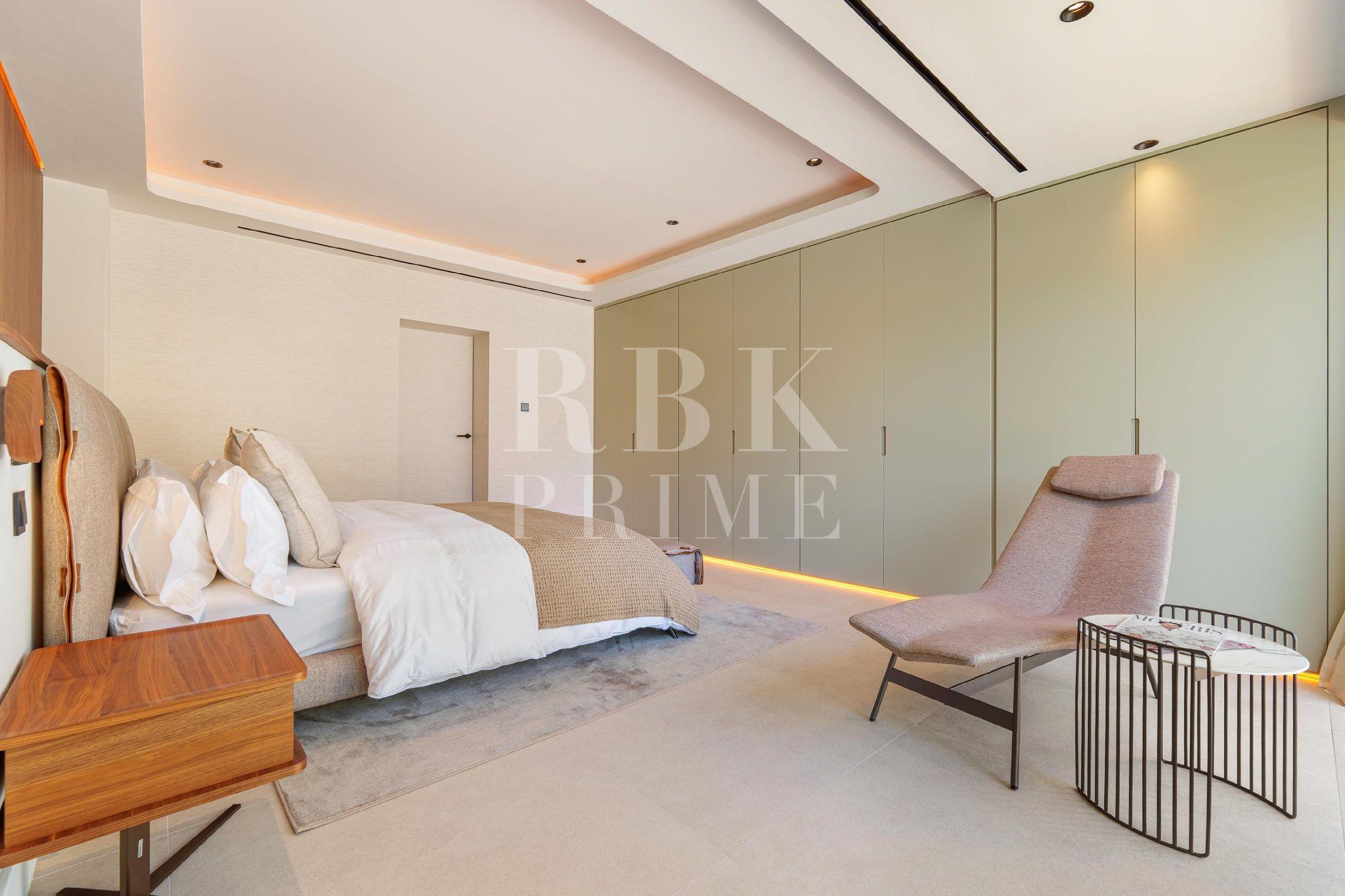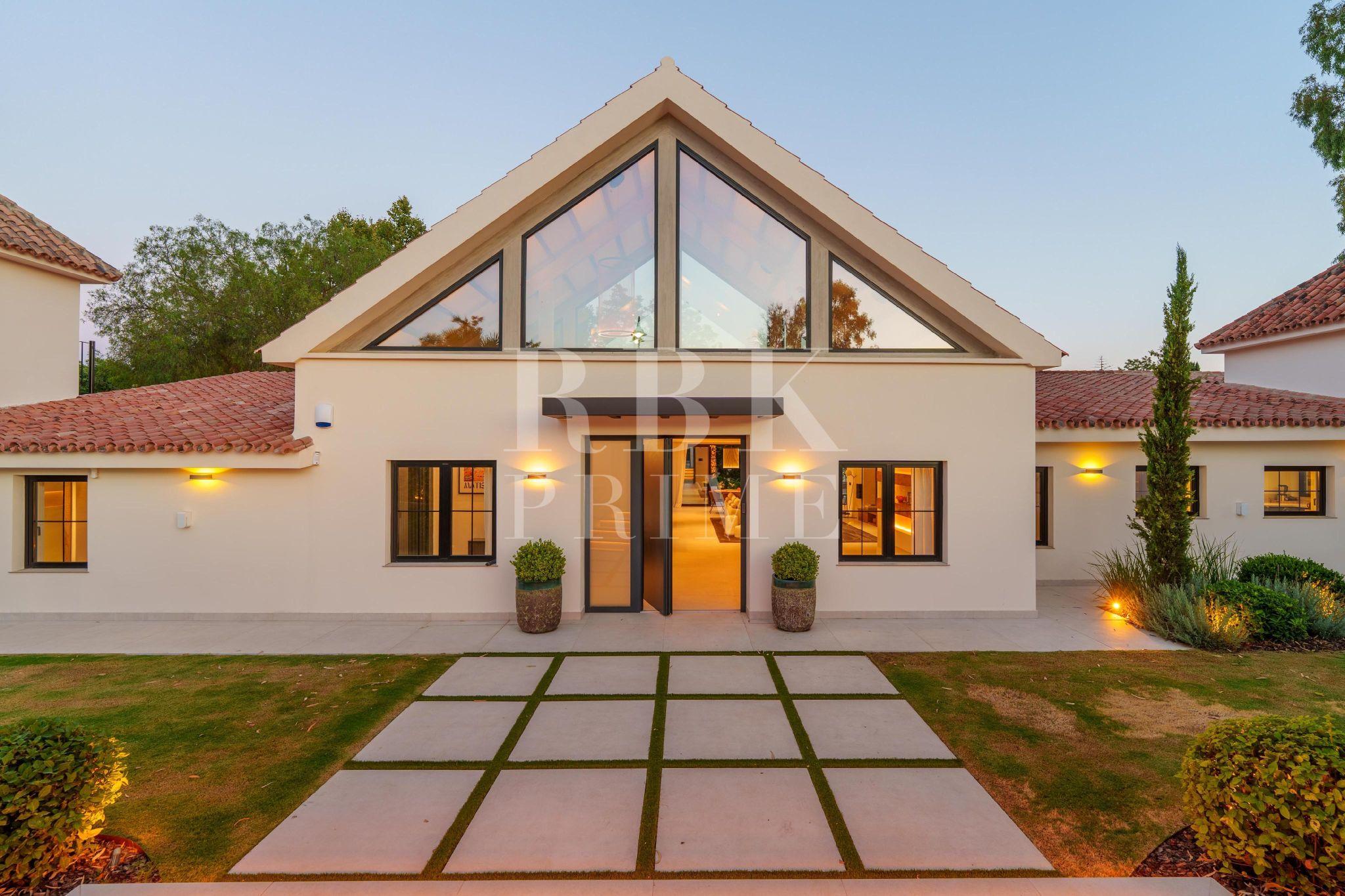 Exceptional single-story villa for sale, located in Marbella (Malaga), just minutes from the lively Puerto Banús. It offers modern and sophisticated living, with a seamless transition between indoor and outdoor spaces. With a surface area of 336 m² and total privacy, the villa has 5 spacious bedrooms, including a master suite that opens directly onto the pool terrace and features a luxurious bathroom with a bathtub. The interior is open plan with an impressive double-height ceiling in the entrance hall, floor-to-ceiling windows, and a geometric line on the ceiling that adds architectural charm. The fully equipped kitchen is integrated with the dining and living rooms, which have a fireplace. Outside there is a garden and a pool with a Jacuzzi, surrounded by wooden decking. The main terrace has a dining area with BBQ for relaxation and socializing, as well as an outdoor area ideal for enjoying the Costa del Sol climate year-round. This is a unique opportunity to acquire a turnkey villa that combines privacy, design, and an excellent coastal location.
