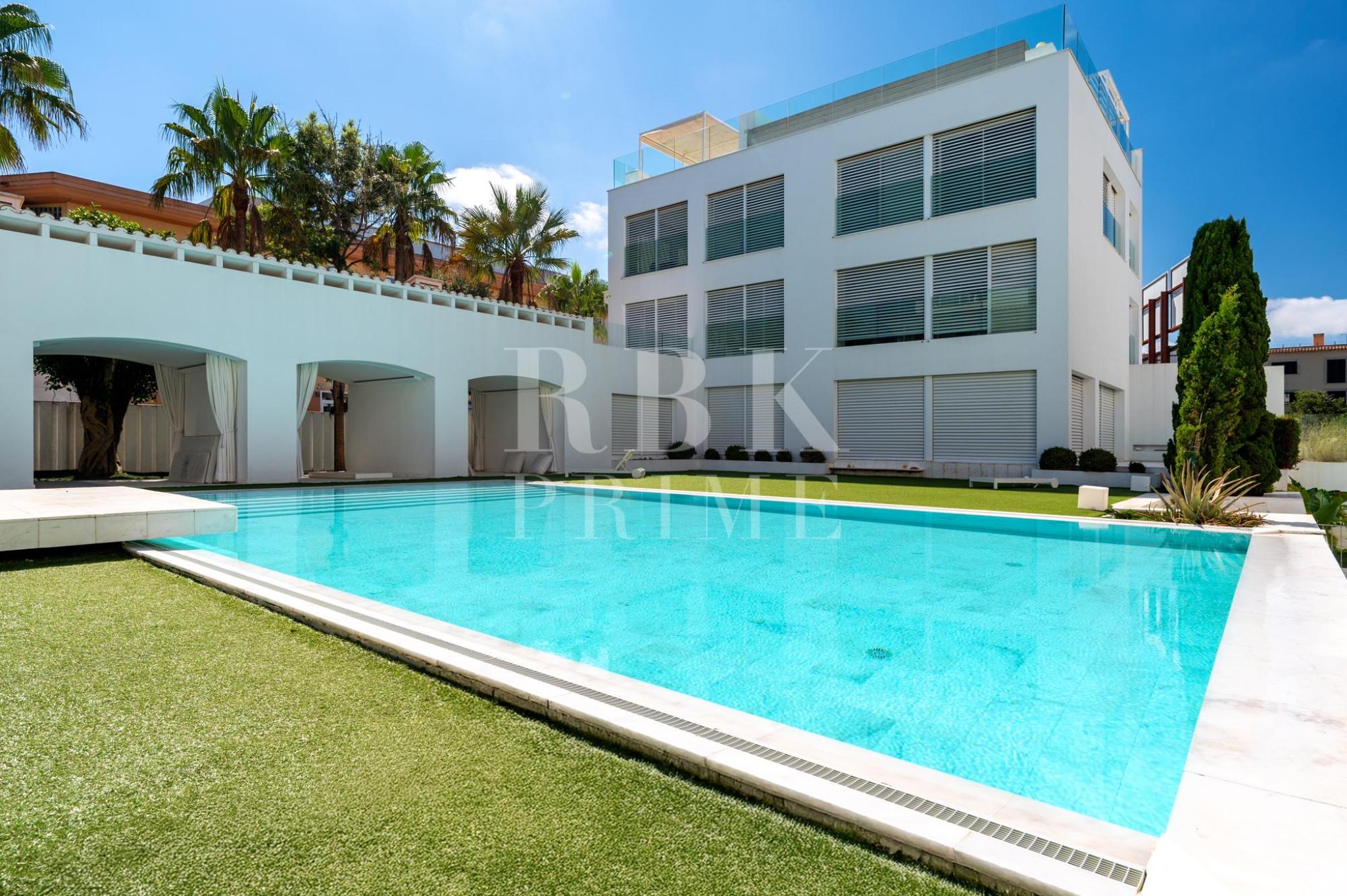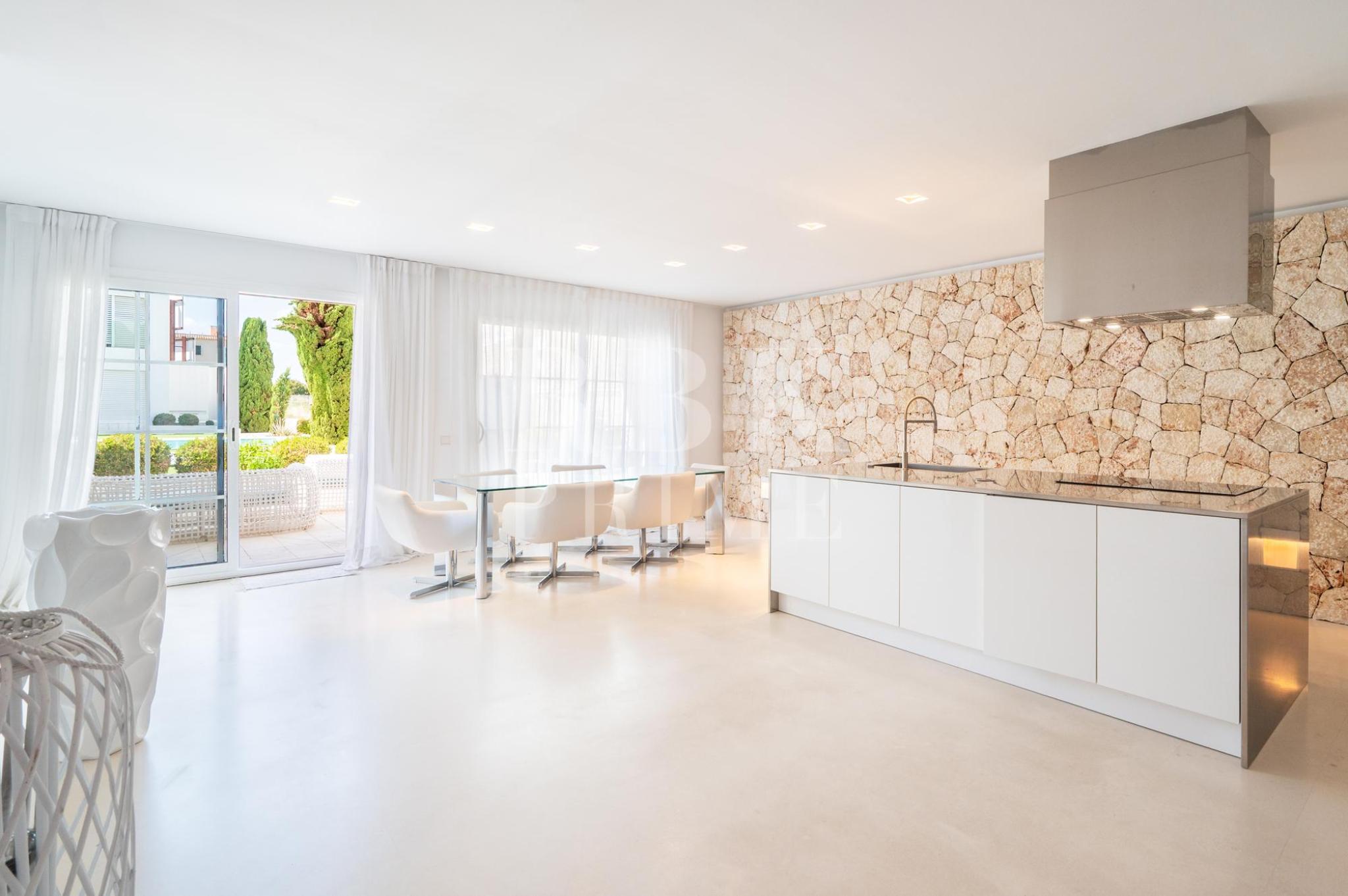 Stunning ground floor apartment for sale in Porto Cristo, Mallorca, located in an exclusive residential complex, combining modern design, comfort, and privacy. With a built area of 217 m², it has three spacious double bedrooms, two of which are en suite, as well as an additional bathroom. Natural stone and parquet flooring enhance the luxurious and spacious feel throughout. The open-plan living room, with 4-metre ceilings and integrates the living area, the open Nolte kitchen with central island, and the dining room, to create a bright and welcoming space. The living room opens onto a 70 m² south-west-facing terrace, with sun all day long, and direct access to the communal swimming pool, as well as the fitness area and sauna. Adjacent to the terrace is a practical laundry room, and the property includes an underground parking space with a storage room. Boasting an alarm system and high-quality finishes, this property is designed to maximise comfort and functionality. This property represents a unique opportunity for those seeking to live in an exclusive seaside setting with easy access to amenities, the marina and beaches.