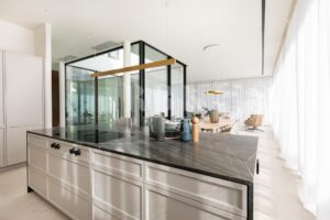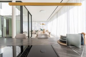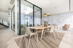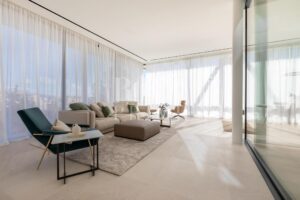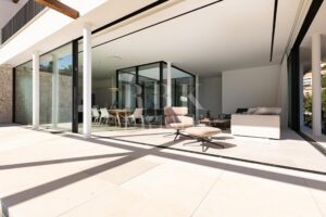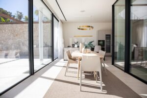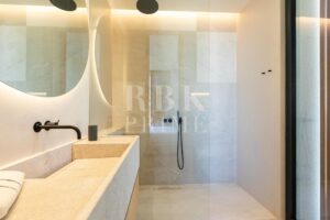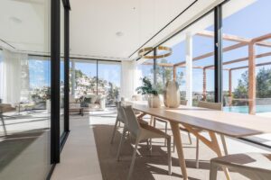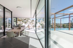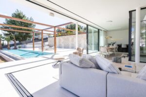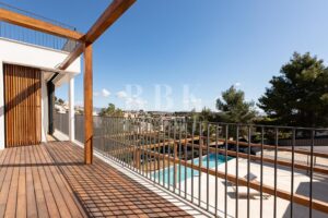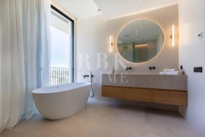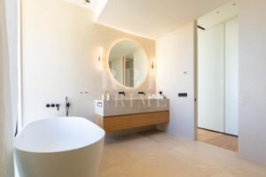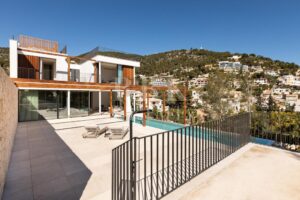 Stunning modern villa of over 500 m² for sale in Génova, Mallorca. This contemporary property stands out for its elegant and bright design, with a central atrium with vegetation that illuminates all the rooms. On the ground floor, there is an entrance hall, a practical laundry/utility room, a double bedroom with en-suite bathroom, and an open-plan kitchen with dining area and lounge. Floor-to-ceiling windows connect the living area to the terrace, seamlessly integrating the interior with the exterior. The first floor houses three double bedrooms with private bathrooms, two of which have access to a shared terrace overlooking the natural surroundings. From this floor, a staircase leads to the 83 m² roof terrace, which offers 360° panoramic views, including Genoa and the sea. The basement has an additional bedroom with a private bathroom and a large garage for three vehicles. Set on a slightly sloping plot, the property is surrounded by landscaped gardens and an infinity pool. Built with top-quality materials and high-end appliances, the villa combines light woods, natural stone cladding and large glass surfaces, creating a bright and warm atmosphere.