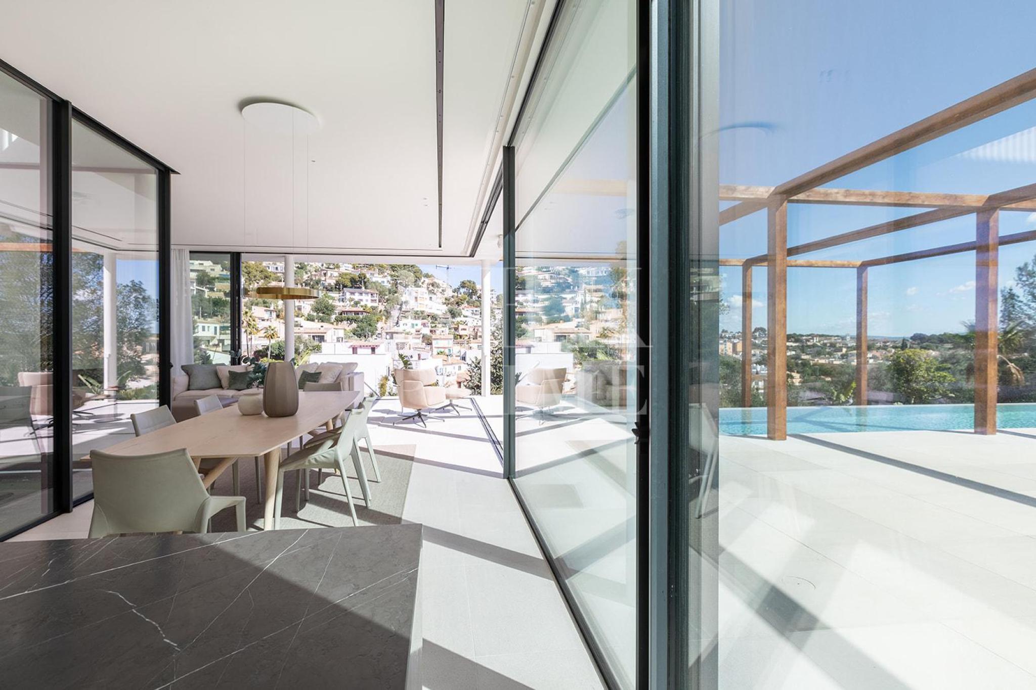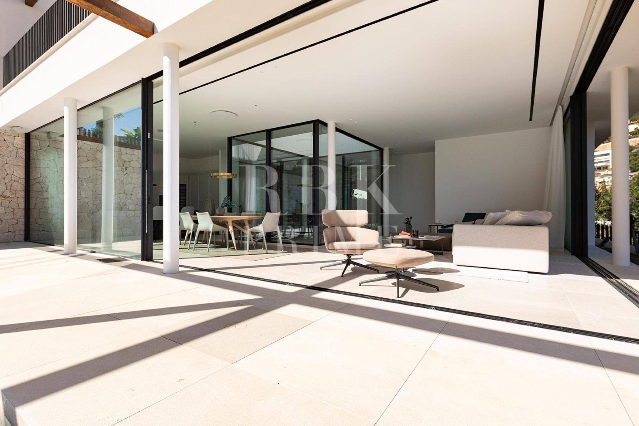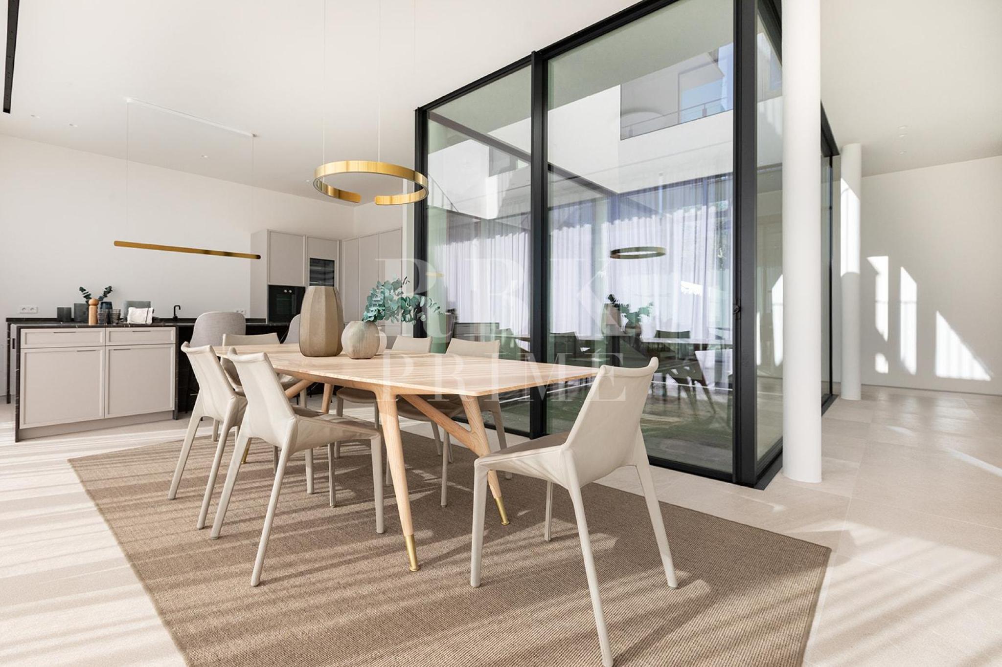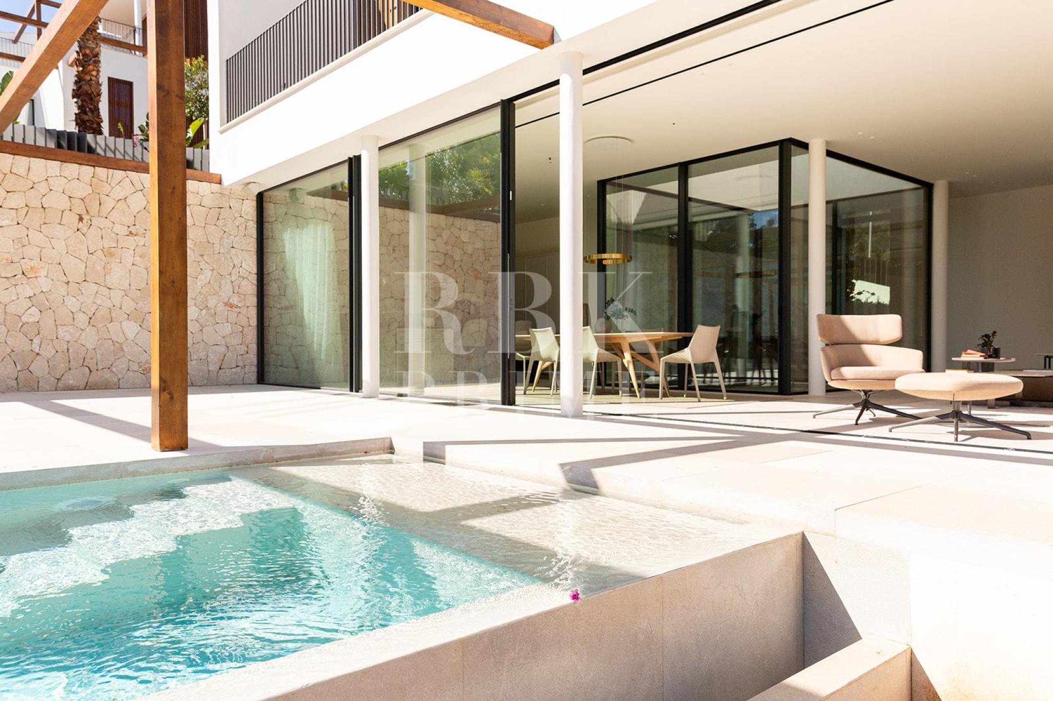 Stunning modern villa of over 500 m² for sale in Génova, Mallorca. This contemporary property stands out for its elegant and bright design, with a central atrium with vegetation that illuminates all the rooms. On the ground floor, there is an entrance hall, a practical laundry/utility room, a double bedroom with en-suite bathroom, and an open-plan kitchen with dining area and lounge. Floor-to-ceiling windows connect the living area to the terrace, seamlessly integrating the interior with the exterior. The first floor houses three double bedrooms with private bathrooms, two of which have access to a shared terrace overlooking the natural surroundings. From this floor, a staircase leads to the 83 m² roof terrace, which offers 360° panoramic views, including Genoa and the sea. The basement has an additional bedroom with a private bathroom and a large garage for three vehicles. Set on a slightly sloping plot, the property is surrounded by landscaped gardens and an infinity pool. Built with top-quality materials and high-end appliances, the villa combines light woods, natural stone cladding and large glass surfaces, creating a bright and warm atmosphere.