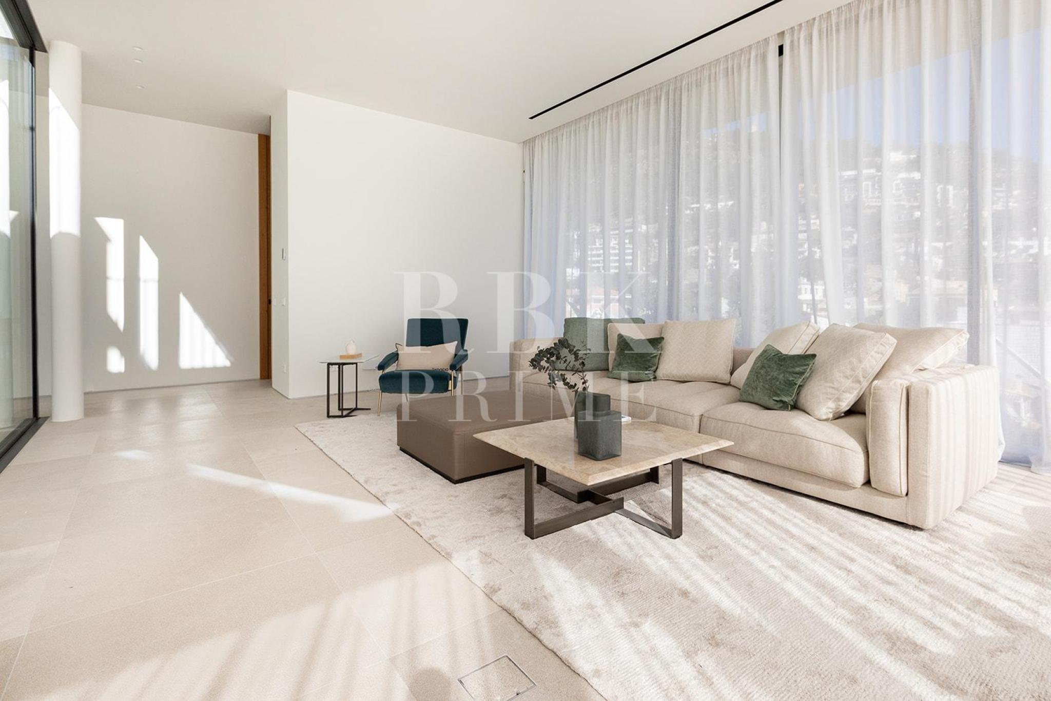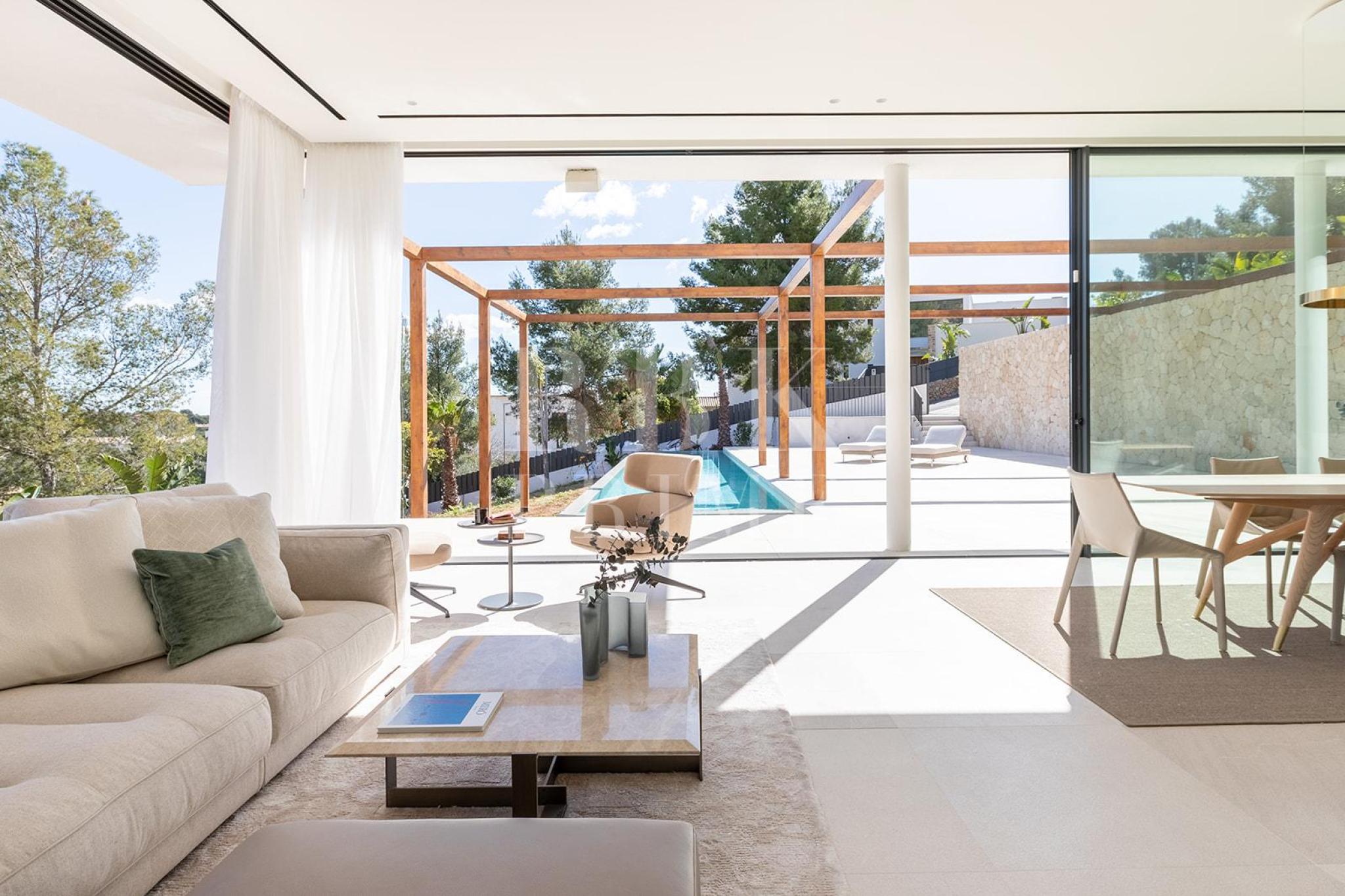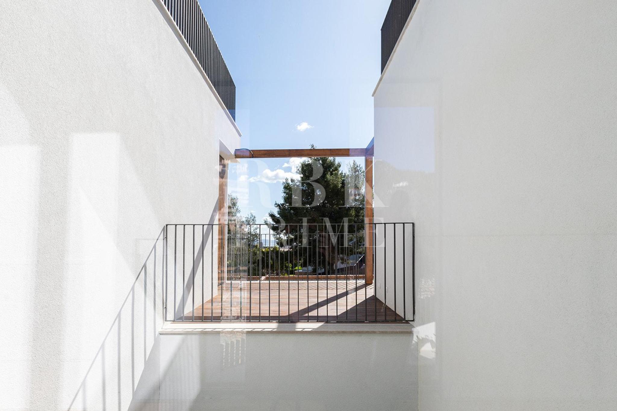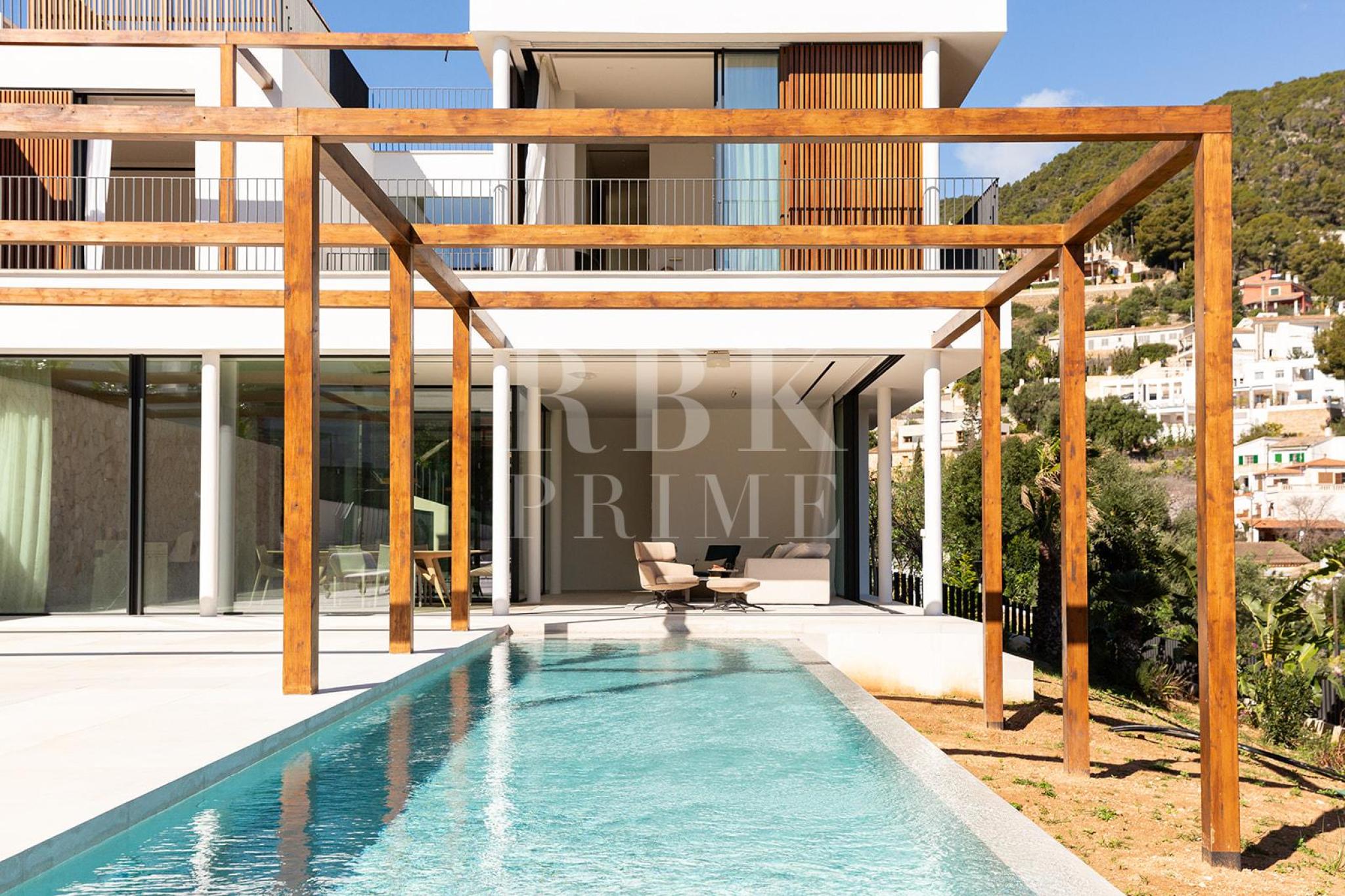 Stunning modern villa of over 500 m² for sale in Génova, Mallorca. This contemporary property stands out for its elegant and bright design, with a central atrium with vegetation that illuminates all the rooms. On the ground floor, there is an entrance hall, a practical laundry/utility room, a double bedroom with en-suite bathroom, and an open-plan kitchen with dining area and lounge. Floor-to-ceiling windows connect the living area to the terrace, seamlessly integrating the interior with the exterior. The first floor houses three double bedrooms with private bathrooms, two of which have access to a shared terrace overlooking the natural surroundings. From this floor, a staircase leads to the 83 m² roof terrace, which offers 360° panoramic views, including Genoa and the sea. The basement has an additional bedroom with a private bathroom and a large garage for three vehicles. Set on a slightly sloping plot, the property is surrounded by landscaped gardens and an infinity pool. Built with top-quality materials and high-end appliances, the villa combines light woods, natural stone cladding and large glass surfaces, creating a bright and warm atmosphere.