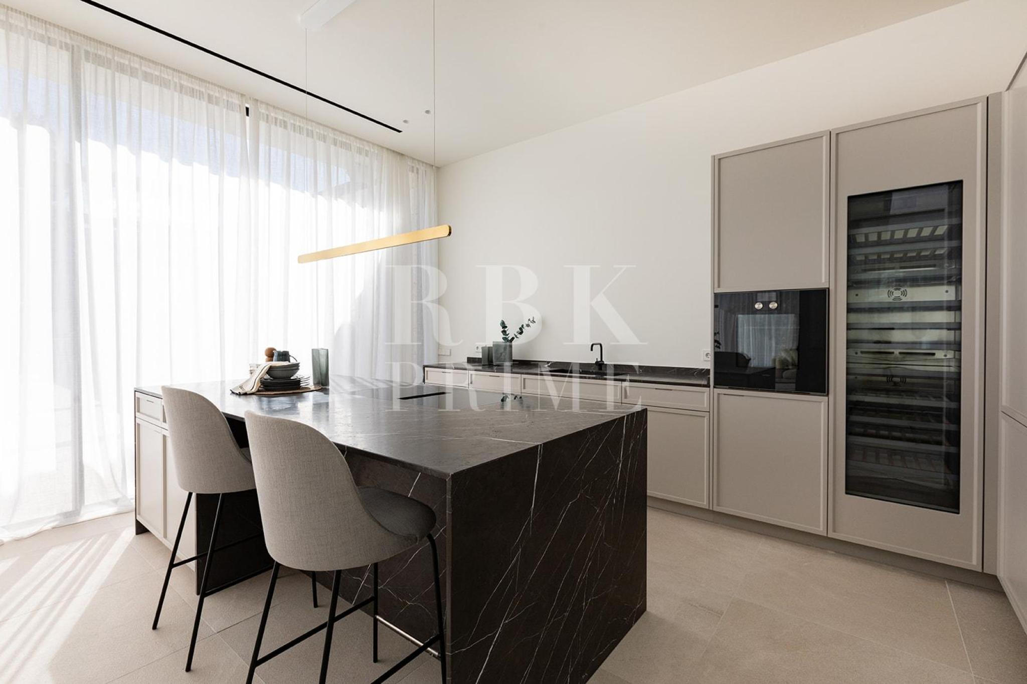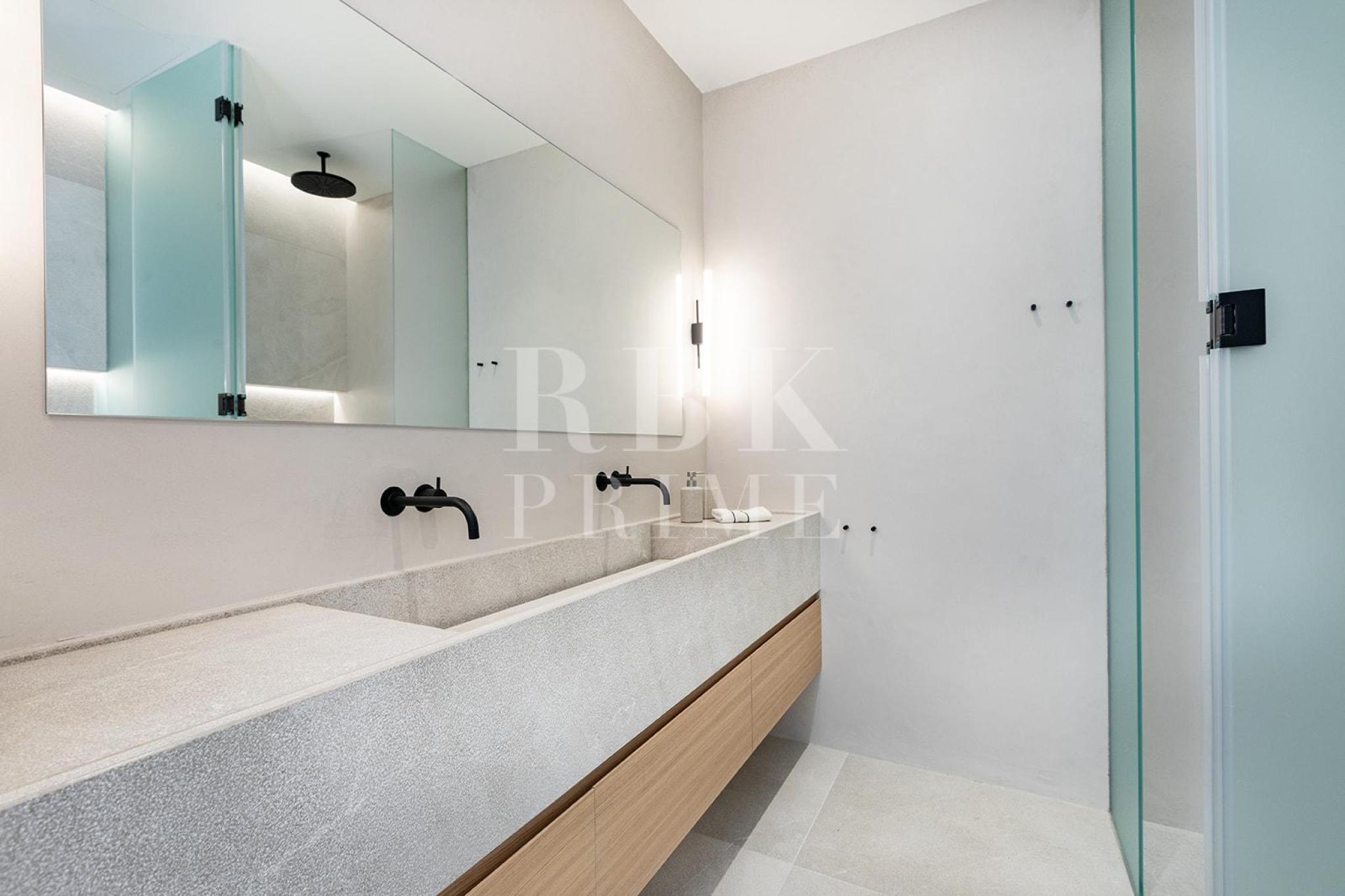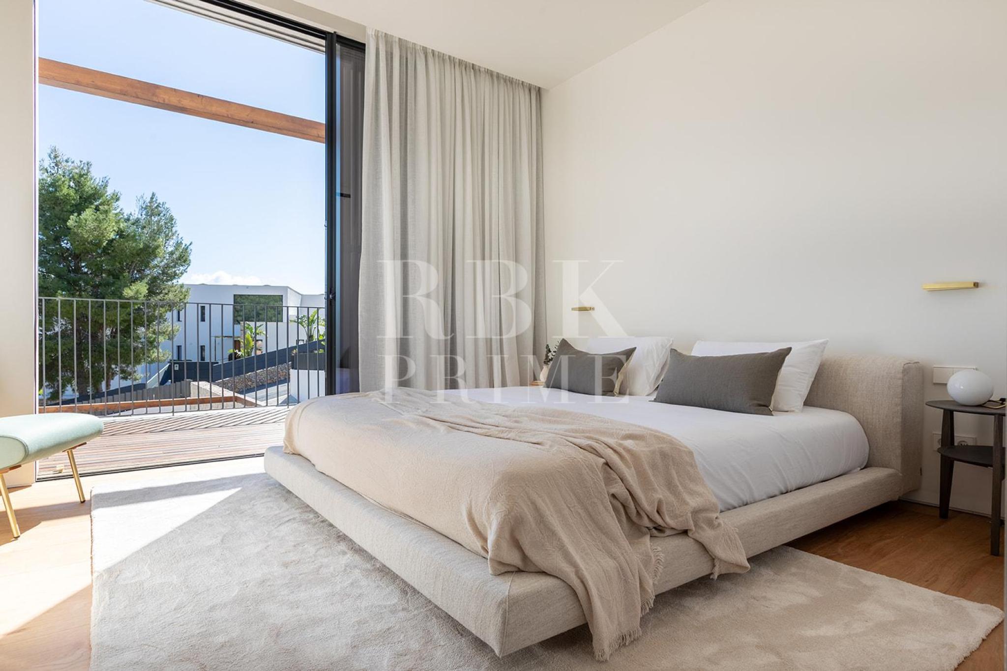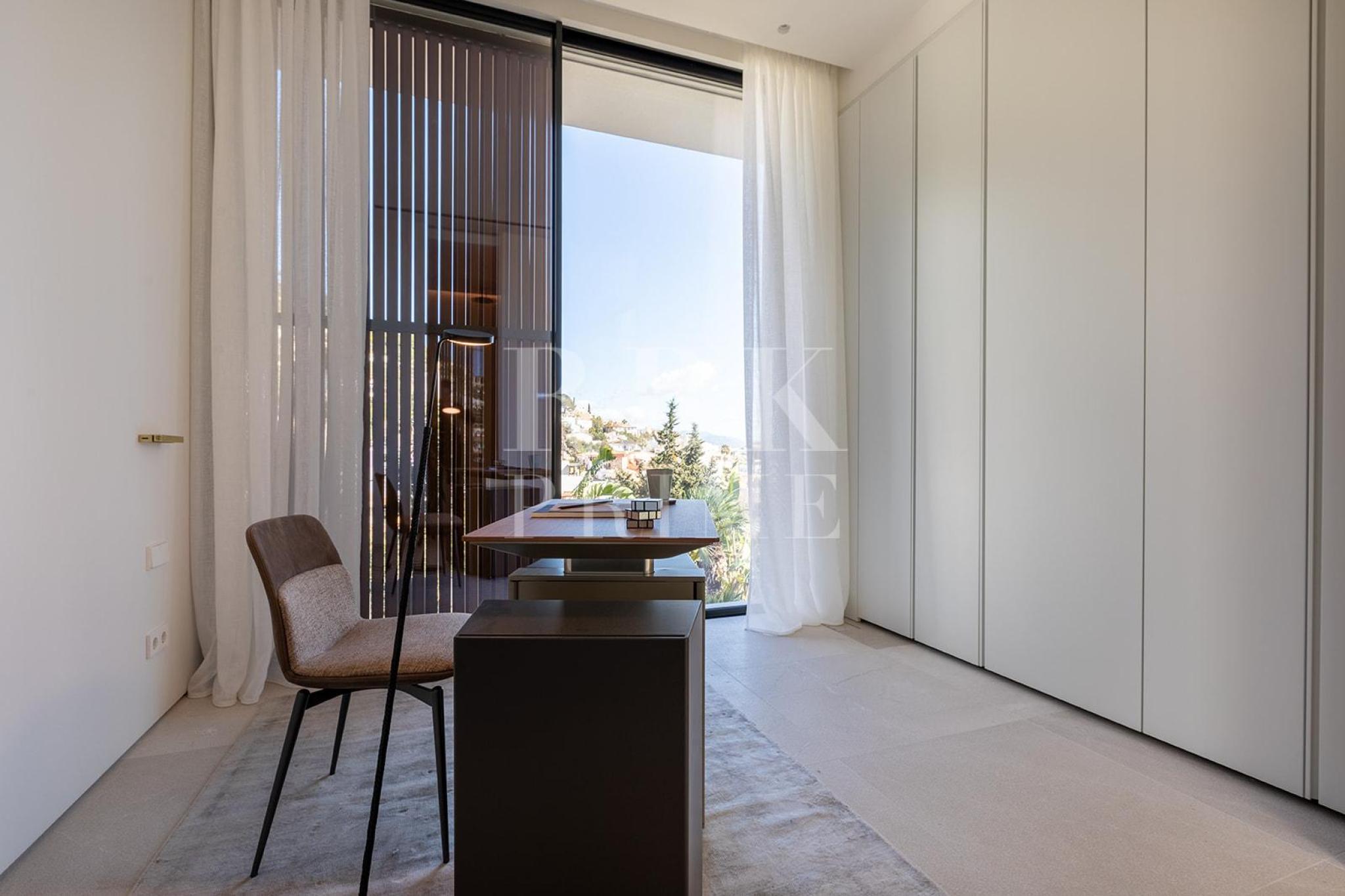Stunning modern villa of over 500 m² for sale in Génova, Mallorca. This contemporary property stands out for its elegant and bright design, with a central atrium with vegetation that illuminates all the rooms. On the ground floor, there is an entrance hall, a practical laundry/utility room, a double bedroom with en-suite bathroom, and an open-plan kitchen with dining area and lounge. Floor-to-ceiling windows connect the living area to the terrace, seamlessly integrating the interior with the exterior. The first floor houses three double bedrooms with private bathrooms, two of which have access to a shared terrace overlooking the natural surroundings. From this floor, a staircase leads to the 83 m² roof terrace, which offers 360° panoramic views, including Genoa and the sea. The basement has an additional bedroom with a private bathroom and a large garage for three vehicles. Set on a slightly sloping plot, the property is surrounded by landscaped gardens and an infinity pool. Built with top-quality materials and high-end appliances, the villa combines light woods, natural stone cladding and large glass surfaces, creating a bright and warm atmosphere.
