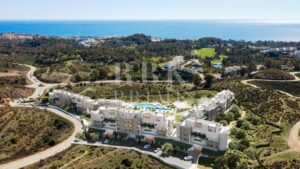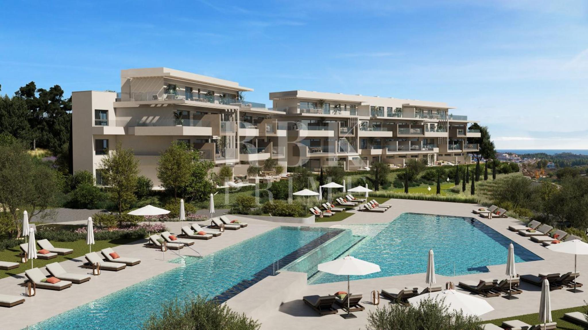 Exclusive new-build penthouse for sale in El Chaparral, Mijas Costa (Málaga). The property is located in a privileged residential complex, in a natural environment surrounded by golf courses, just a few minutes from the sea and close to the future Gran Parque de la Costa del Sol. The property has 3 bedrooms and 2 bathrooms, with an approximate built area of 134 m² and a large 103 m² terrace, ideal for enjoying the Mediterranean climate. The apartment is delivered with a fully equipped kitchen with integrated appliances, built-in wardrobes and fully finished bathrooms, as well as a parking space and a storage room. The communal areas include two saltwater swimming pools, one of them infinity, spa, wellness area with heated pool and sauna, gym, coworking space, yoga area, children’s area, volleyball court, putting green, organic gardens, viewpoint and large landscaped gardens. Delivery of the homes is expected in early 2028. The images are renders and the information corresponds to the developer’s design.