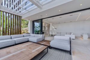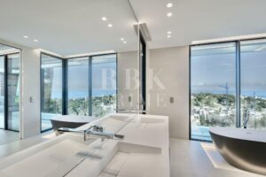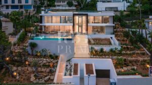 Exclusive newly built villa for sale in Costa d'en Blanes, one of the most privileged areas of Mallorca. Spanning 671 m² of built area and featuring 337 m² of terraces across a 1,047 m² plot, it offers the perfect setting to enjoy the Mediterranean climate all year round. The main entrance impresses with a 6.5 m high ceiling and a panoramic glass lift by Thyssen. The living area comprises a lounge, a dining room, and a designer kitchen equipped with Gaggenau appliances, as well as a service kitchen. On the upper floor there are 3 en-suite bedrooms, including a spectacular master suite with a dressing room, a luxury bathroom and terrace, as well as an office with inspiring views. The ground floor comprises a separate guest apartment with a living room, a bathroom and a private terrace, as well as a leisure area with a pre-installed cinema, a spa and a gym. The villa has a garage for six vehicles, an infinity pool, and a rooftop terrace offering stunning views. Features include underfloor heating, advanced climate control, air purification, home automation, and luxury finishes with furniture by Minotti, Gubi, and Rimadesio. A sophisticated residence in a prime location with stunning views, this property represents a unique opportunity to enjoy a luxurious Mediterranean lifestyle.