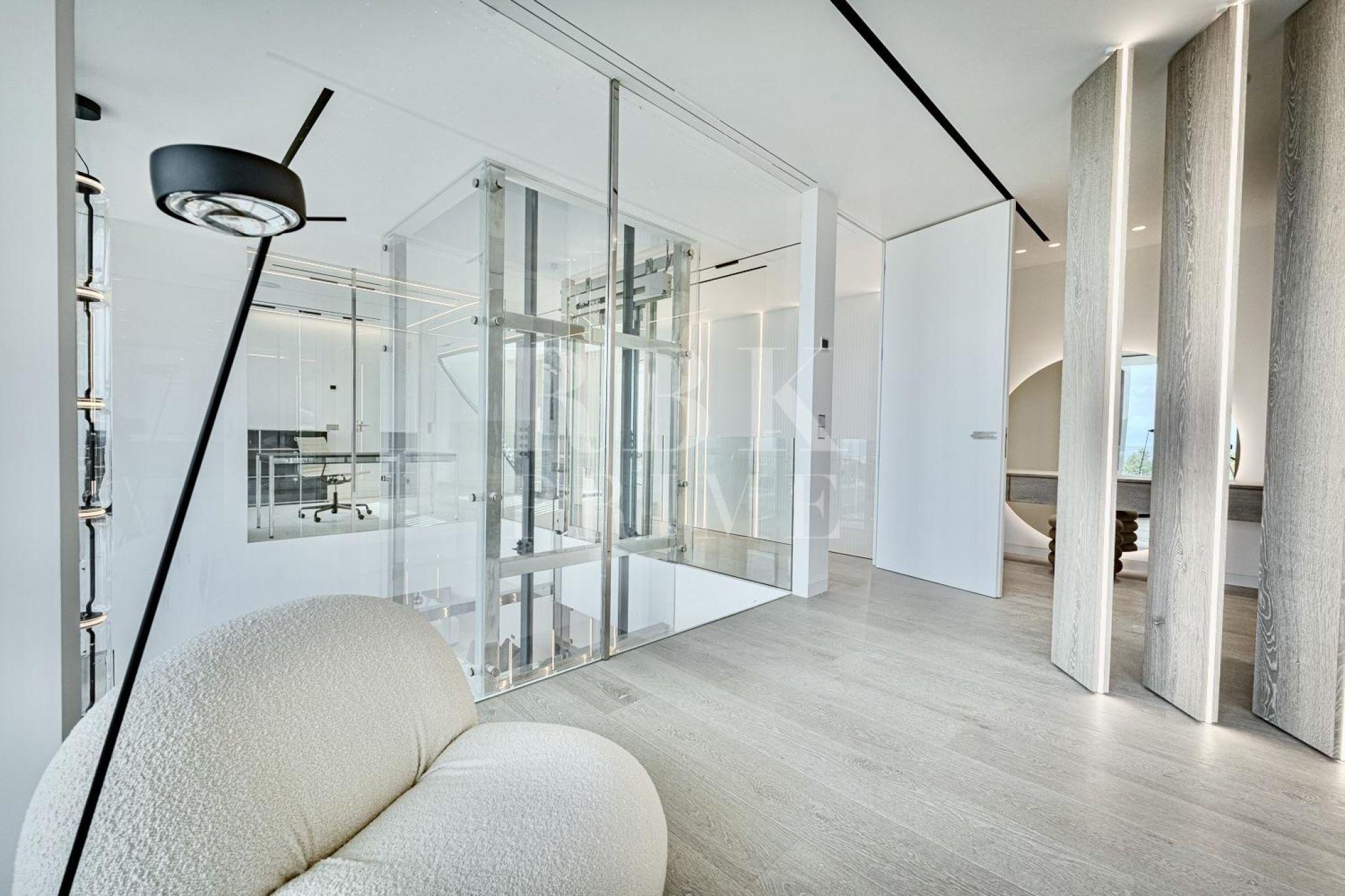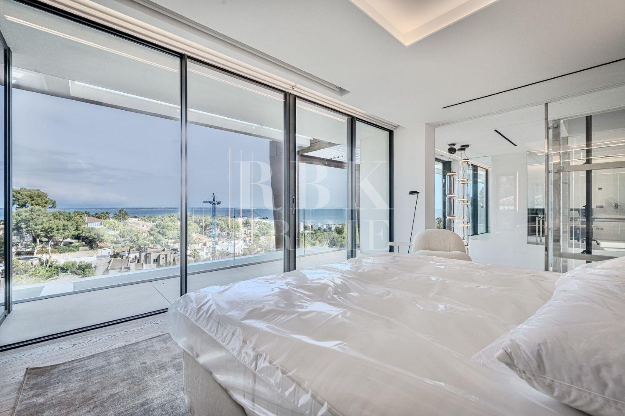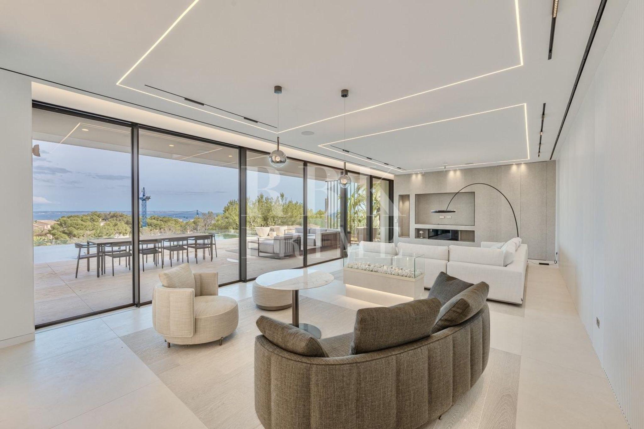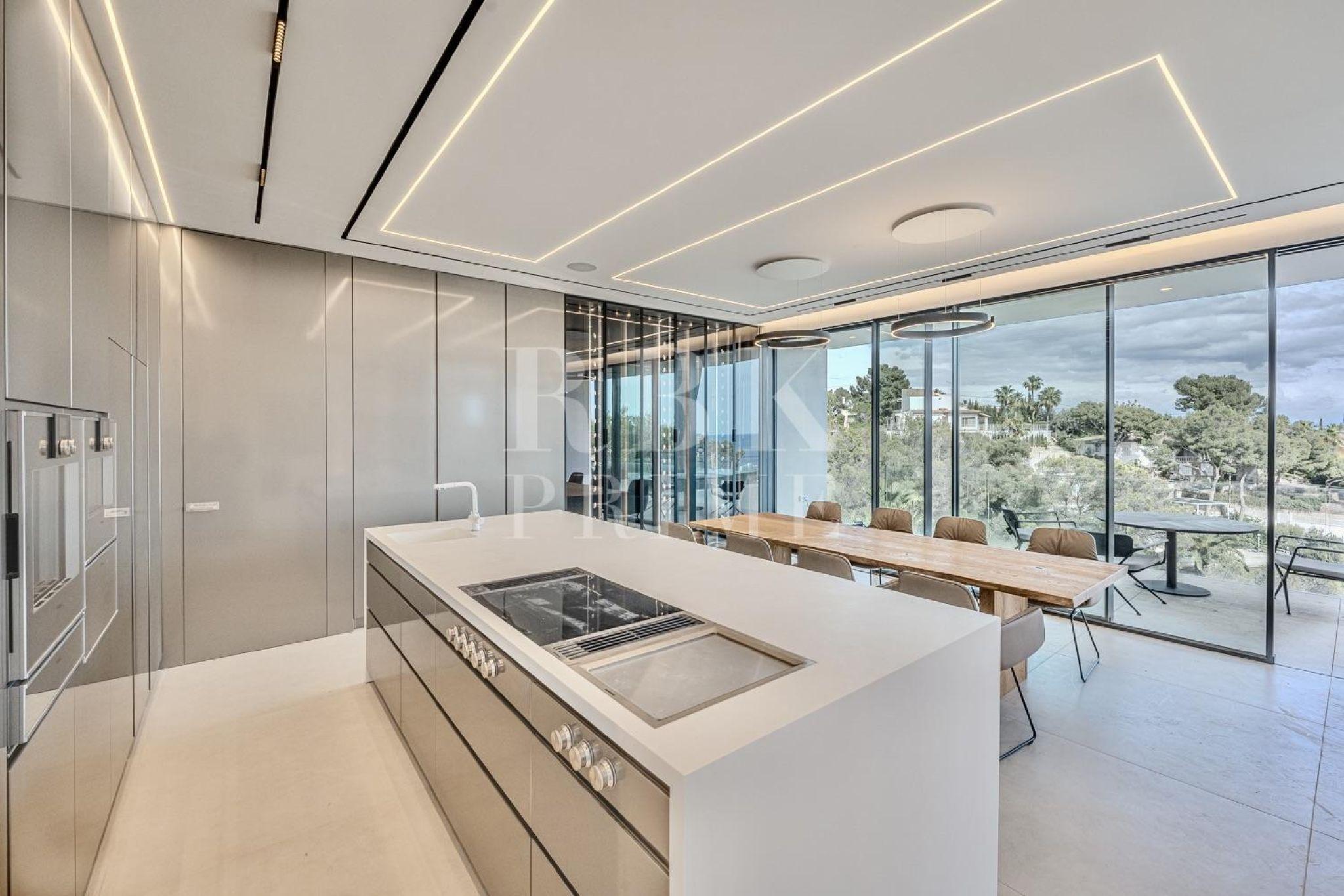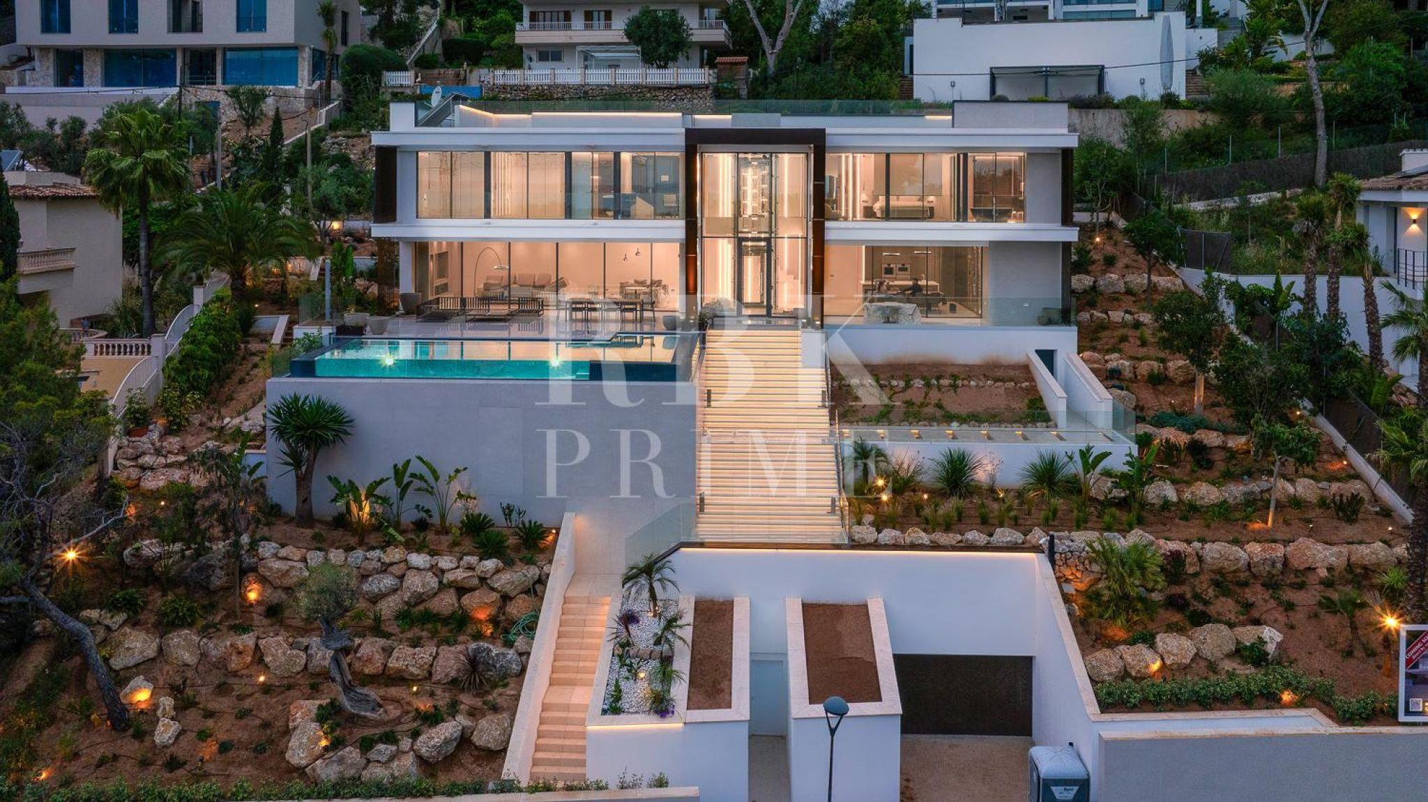 Exclusive newly built villa for sale in Costa d'en Blanes, one of the most privileged areas of Mallorca. Spanning 671 m² of built area and featuring 337 m² of terraces across a 1,047 m² plot, it offers the perfect setting to enjoy the Mediterranean climate all year round. The main entrance impresses with a 6.5 m high ceiling and a panoramic glass lift by Thyssen. The living area comprises a lounge, a dining room, and a designer kitchen equipped with Gaggenau appliances, as well as a service kitchen. On the upper floor there are 3 en-suite bedrooms, including a spectacular master suite with a dressing room, a luxury bathroom and terrace, as well as an office with inspiring views. The ground floor comprises a separate guest apartment with a living room, a bathroom and a private terrace, as well as a leisure area with a pre-installed cinema, a spa and a gym. The villa has a garage for six vehicles, an infinity pool, and a rooftop terrace offering stunning views. Features include underfloor heating, advanced climate control, air purification, home automation, and luxury finishes with furniture by Minotti, Gubi, and Rimadesio. A sophisticated residence in a prime location with stunning views, this property represents a unique opportunity to enjoy a luxurious Mediterranean lifestyle.