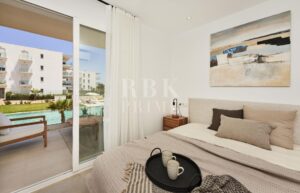 Newly-built flat for sale in a residential complex in Cala d'Or, Mallorca. It is a project of flats with 2 bedrooms and 2 bathrooms (1 en-suite), with an architecture in the purest Mediterranean style, where the colour white predominates. The complex is surrounded by large gardens, spacious terraces and 2 communal swimming pools with showers and lighting to enjoy the fantastic climate of the island. The ground floors have large terraces with porches and gardens for private use. The other flats have large terraces with beautiful views of the village, swimming pools and communal gardens. Each flat has a parking space and a storage room. The kitchen comes with white laminate wall and base units, white Silestone worktops and a single stainless steel sink. In addition, everything necessary is included: induction hob, oven and stainless steel extractor hood. Each property has an aerothermal system for hot water production. Delivery of the properties is scheduled for September 2025. The images are renderings.