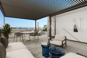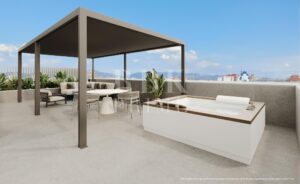 This exclusive newly-built luxury flat for sale is located in a residential complex in Nou Llevant, Palma de Mallorca, just a 10 minute drive from the airport and only a few metres away from the exclusive harbour of Portixol. With a living area of 94 m², the property offers 2 bedrooms and 2 bathrooms, one of them en suite. The open plan kitchen integrates perfectly with the dining room and living room, creating an ideal environment for entertaining and everyday life. The large floor-to-ceiling glass walls maximise the natural light that enters the property. In addition, the property features a 79 m² solarium with a jacuzzi. A practical storage room is also included in the price. The project offers 3 complete lines of interior design, giving a sense of individuality while using the highest quality materials. The communal areas include a gymnasium, a communal swimming pool, a spa, a large communal lounge, cafeteria, golf simulator, 24-hour security, alarm systems, and concierge service. The building has an underground garage with electric vehicle chargers and space for bicycles.