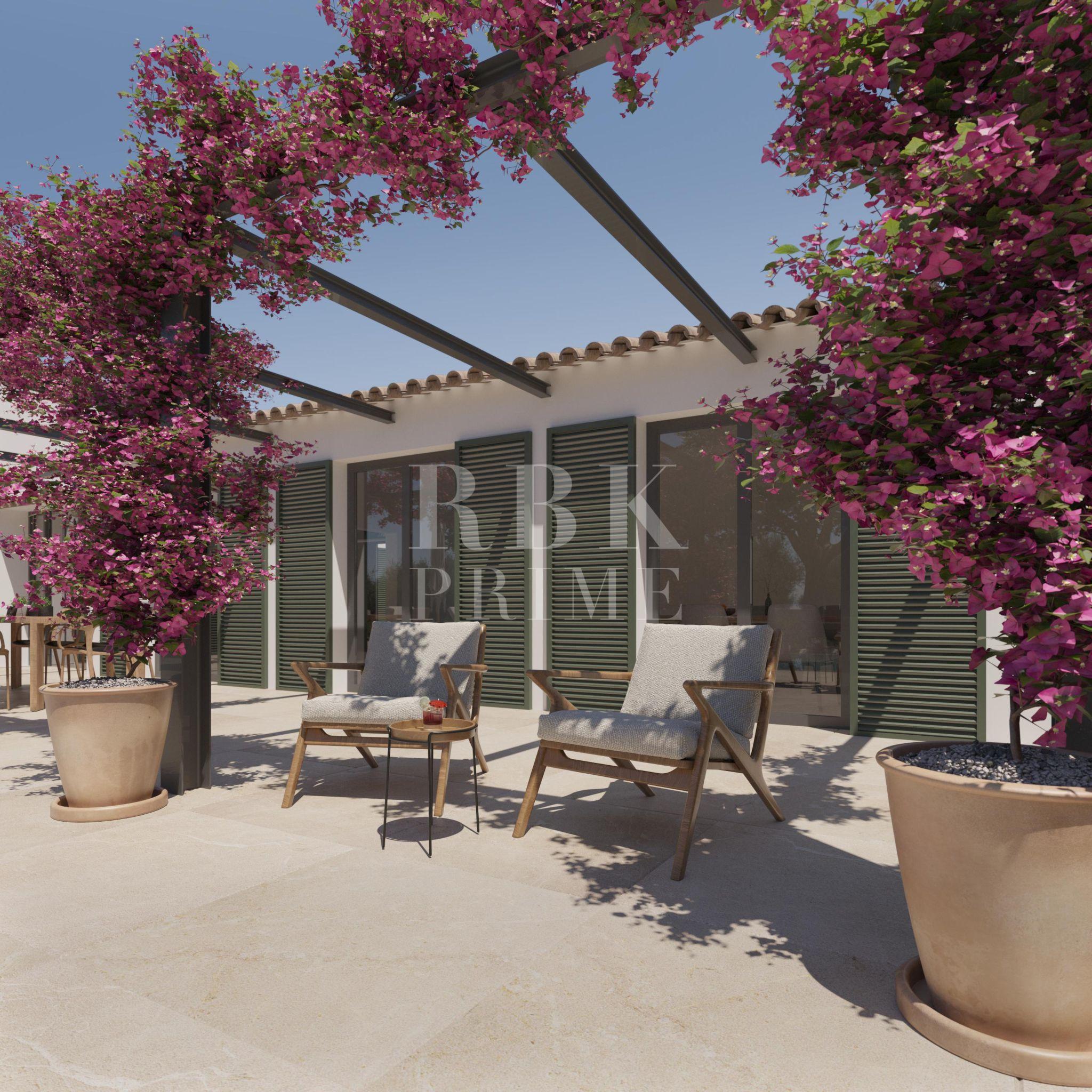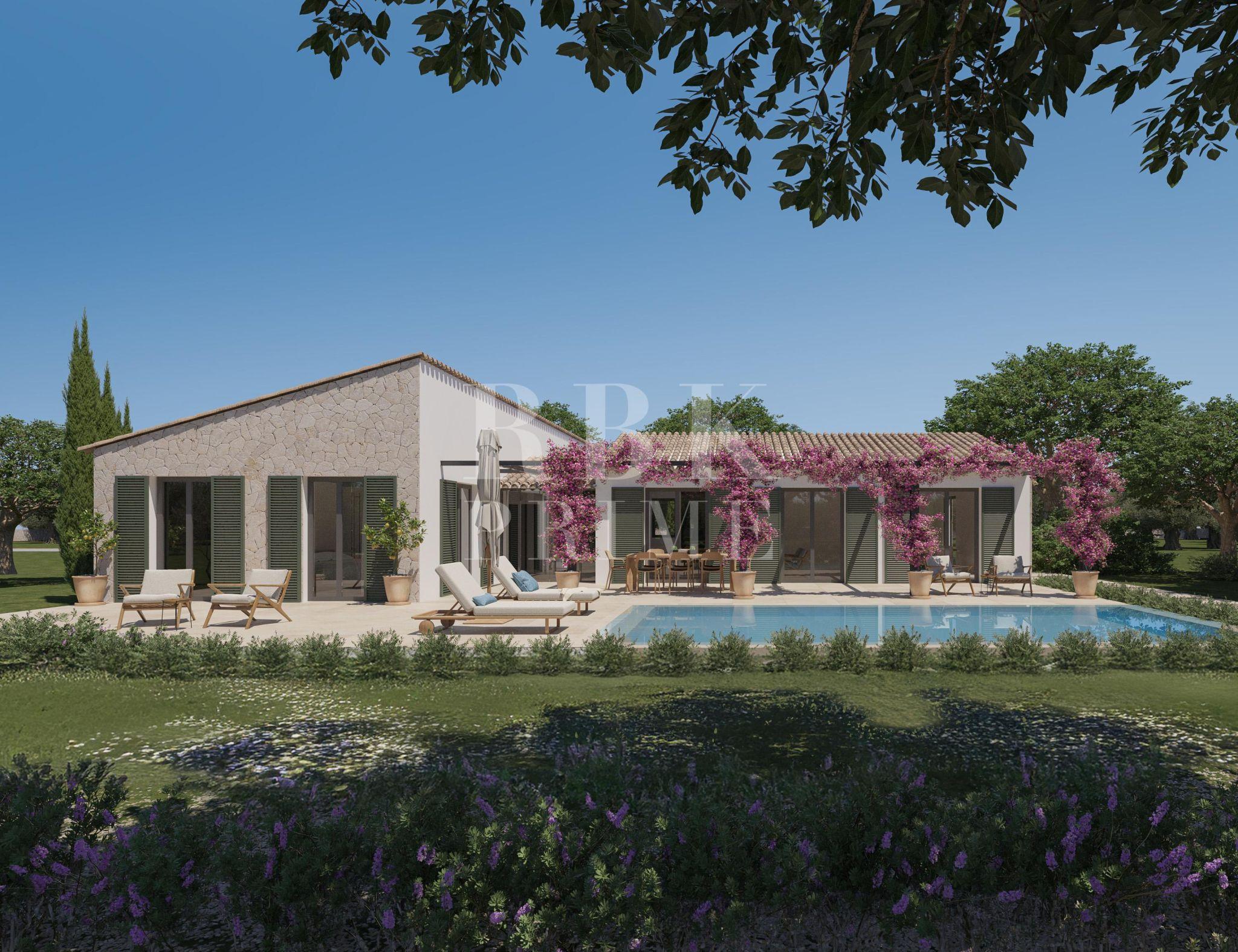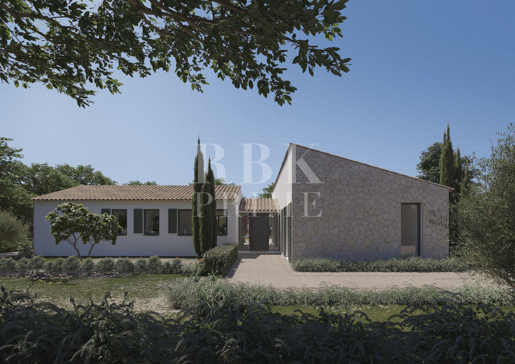 Rural plot in Santa Maria del Camí with planning permission and an approved basic design for the immediate construction of a single-storey detached house. The plot has a total area of 14,215 m² and a proposed floor area of 414 m², of which 208 m² is living space, entirely on a single level. The layout includes three bedrooms with en-suite bathrooms, a guest toilet, a kitchen with a freestanding island, a living-dining room and a utility room with external access. The planned technical specifications include underfloor heating and heat pump air conditioning, a KNX home automation system with remote access, Wi-Fi connectivity and specific ventilation for periods of absence. Outside, there is a 32 m² saltwater swimming pool with a counter-current system and an electric cover, surrounded by terraces with pergolas and traditionally designed gardens with automatic irrigation. The plot is included with planning permission, and the necessary procedures have been initiated for connection to the mains electricity supply and a private well.