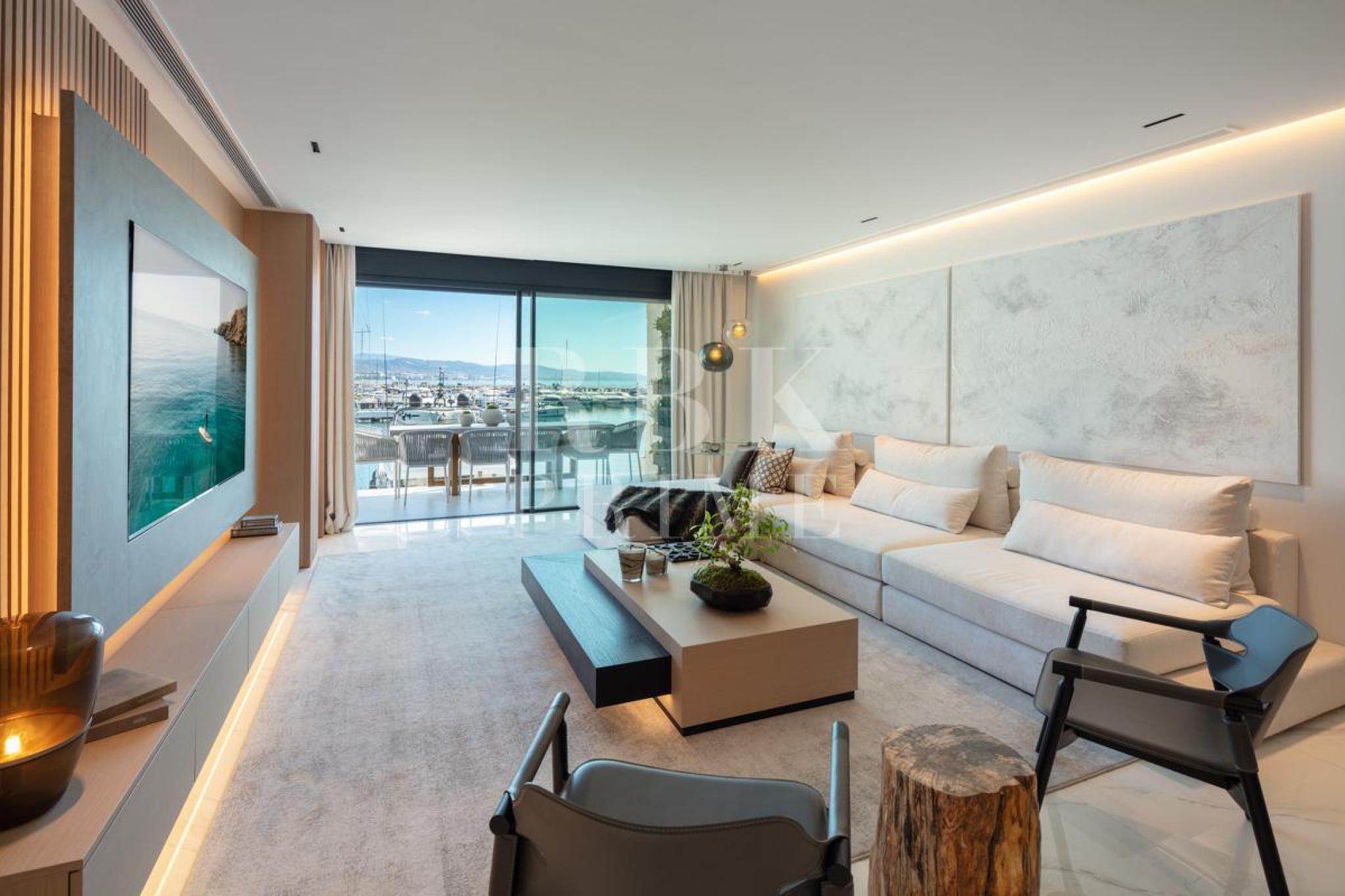 Exclusive apartment for sale on the seafront, located in the renowned Puerto Banús in Marbella, with stunning panoramic views of the Mediterranean and the marina. This unique property that reflects the coastal lifestyle, surrounded by luxury boutiques, prestigious restaurants, and a wide range of leisure activities. The apartment has three bedrooms, each with an en-suite bathroom, offering comfort and privacy. Recently renovated with the finest materials, it boasts an elegant contemporary design where every space has been carefully utilised to accentuate the brightness and privileged views. The open-plan living room is clad in natural wood, equipped with integrated LED lighting and connects directly to an outdoor terrace with spectacular harbour views. The kitchen is equipped with state-of-the-art Gaggenau appliances and combines functionality with sophistication. Thanks to its exceptional location, this property allows you to enjoy all the amenities of Puerto Banús, with immediate access to exclusive shops, beaches, restaurants, and first-class leisure activities.