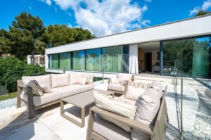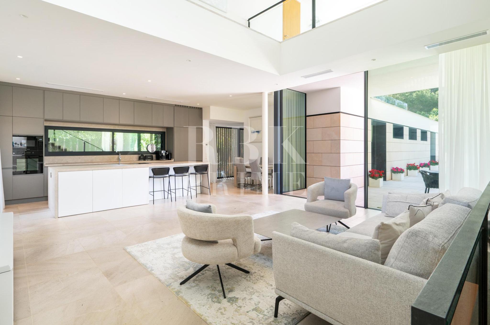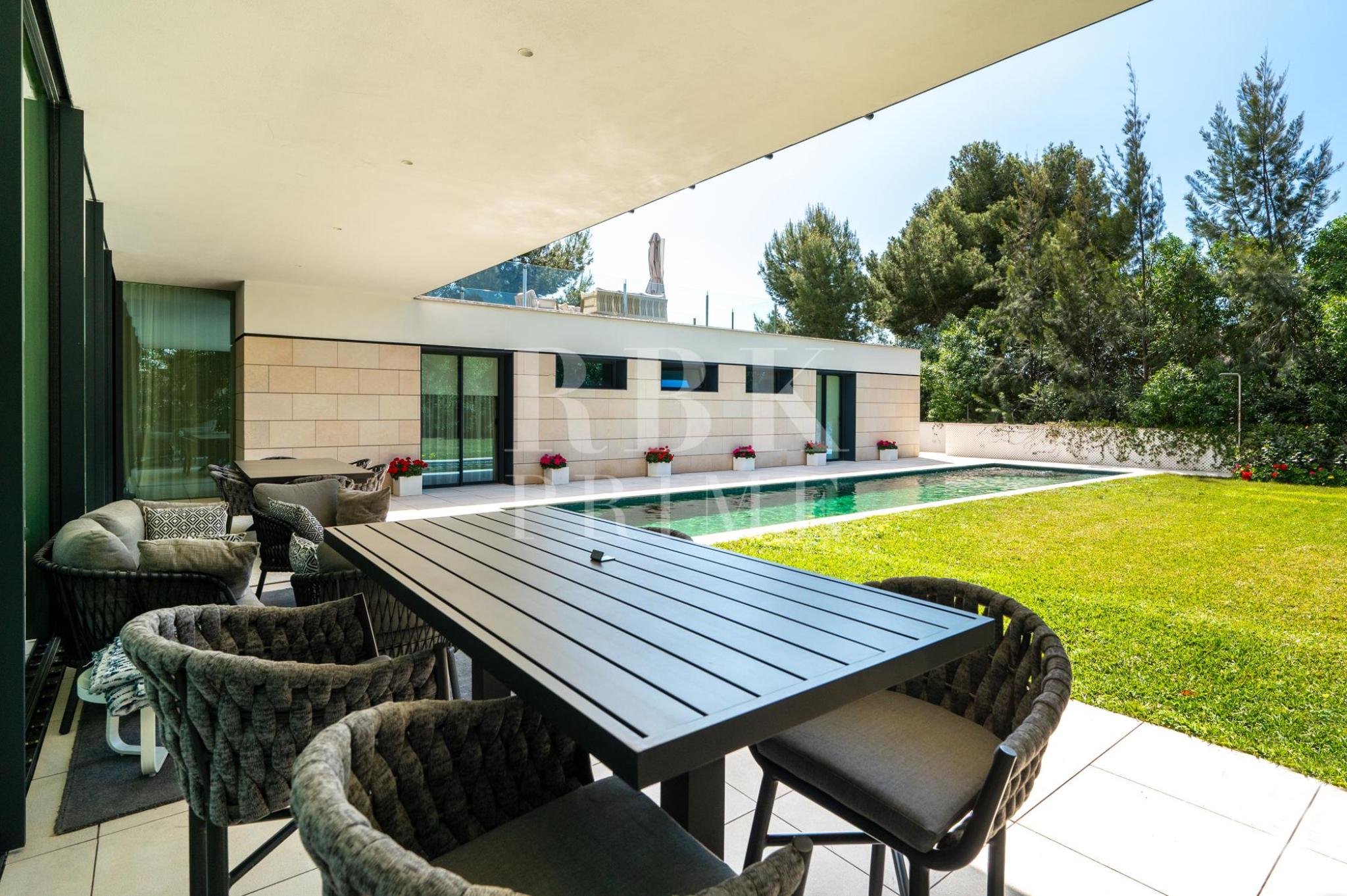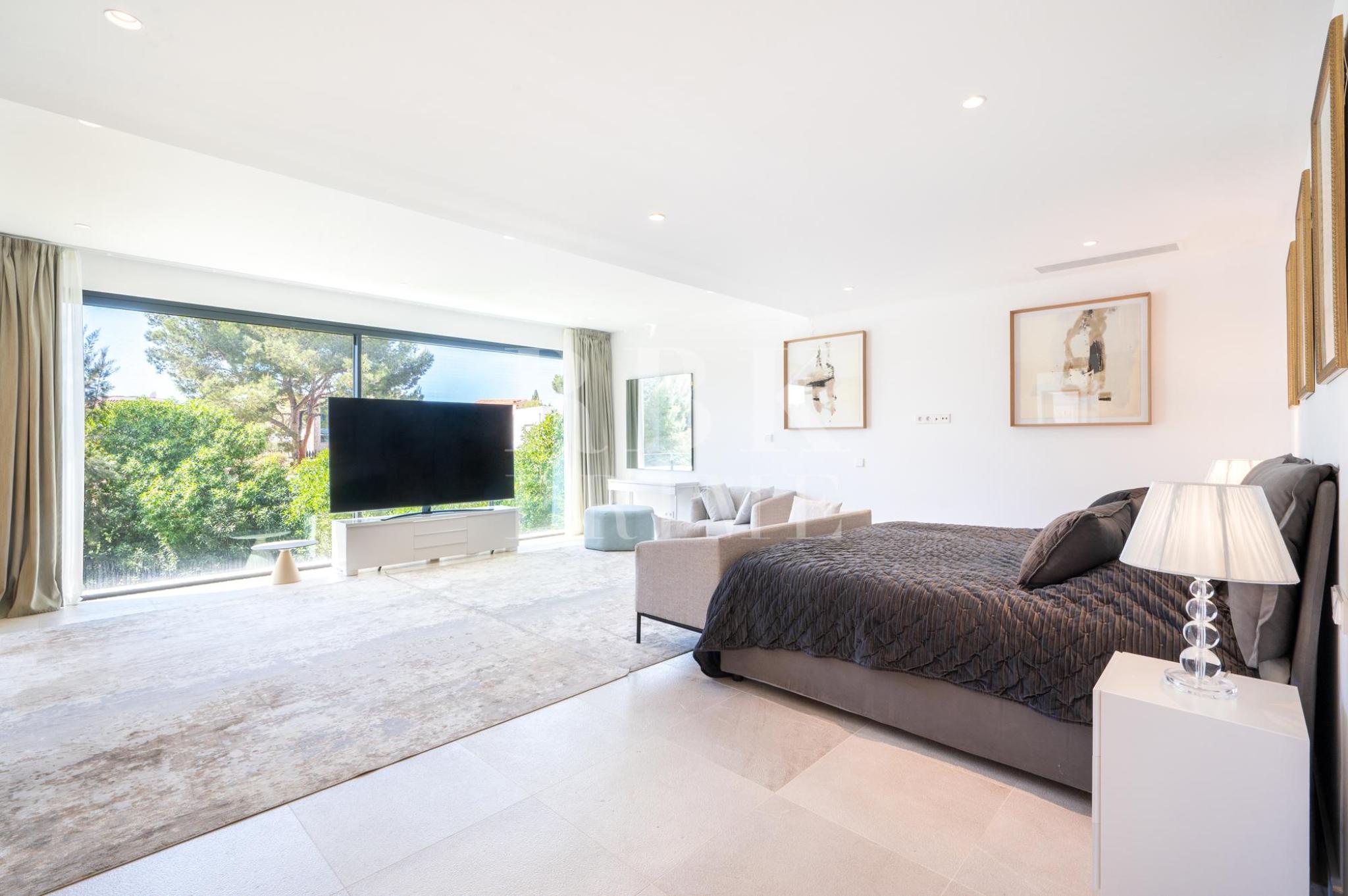 A spectacular modern villa situated in a highly sought-after area in the south-west of Mallorca, in Santa Ponsa. The property is spread over three floors, designed to be both functional and comfortable. The ground floor, with a floor area of 219 m², features a spacious living room with double-height ceilings, an open-plan kitchen-dining area, a TV room and two double bedrooms with en-suite bathrooms, as well as a utility room and a guest toilet. It connects to the outside via several porches totalling 51 m², ideal for enjoying the outdoors all year round. The first floor, measuring approximately 130 m² plus a porch with direct access from one of the bedrooms, houses the relaxation area with two double en-suite bedrooms and a lounge, ideal as a private or relaxation space. The basement offers a floor area of 223 m² and features a large versatile space, with an office and multiple possibilities: from a private gym and cinema room to any other use according to requirements. Outside, the property features a private garden, a 45 m² saltwater swimming pool and parking for 4–5 vehicles.
