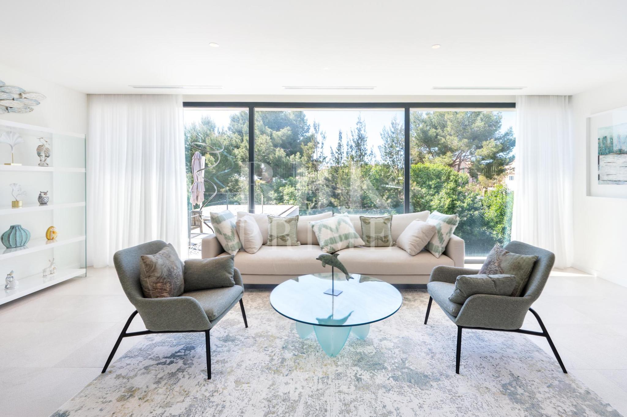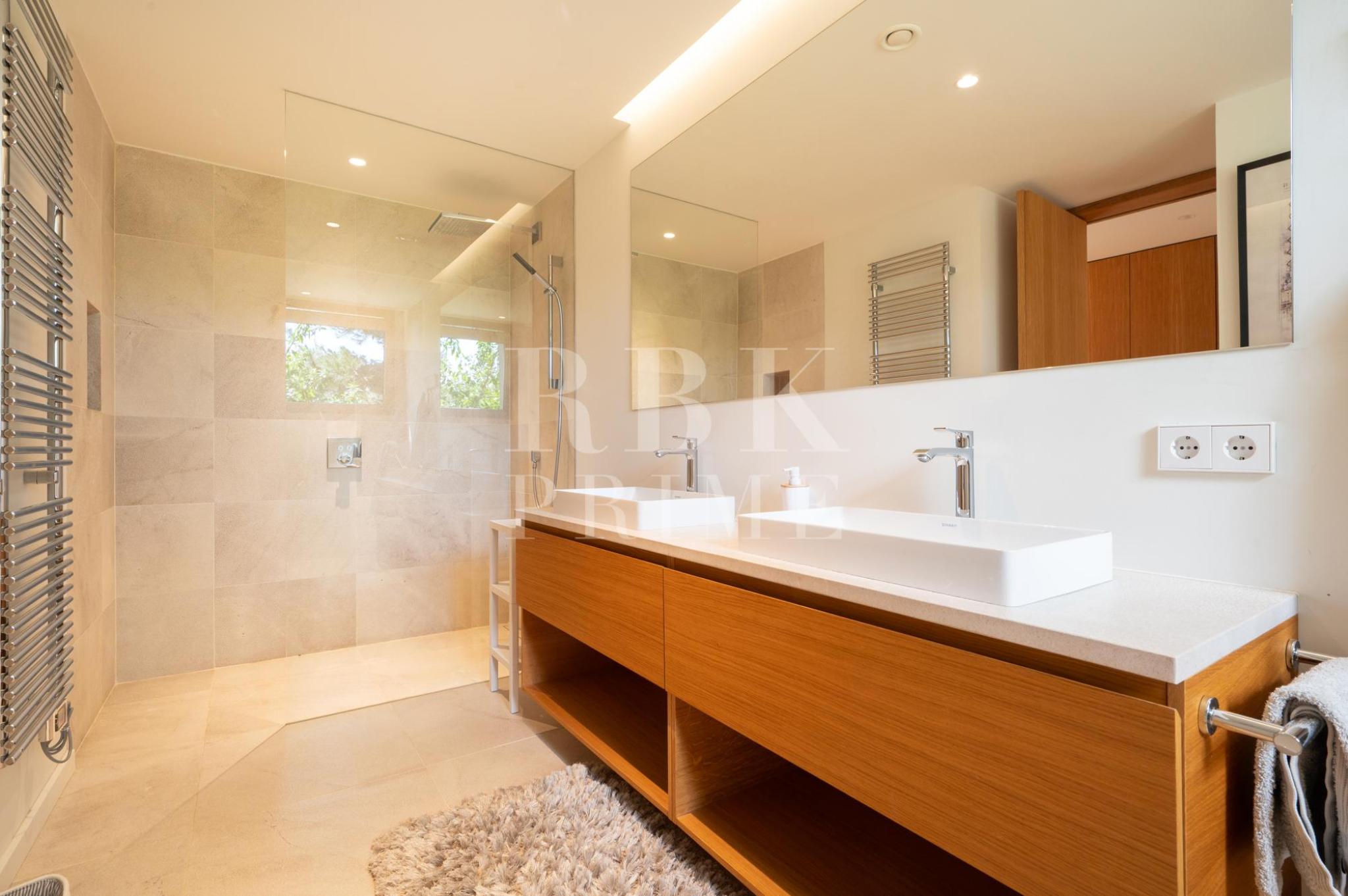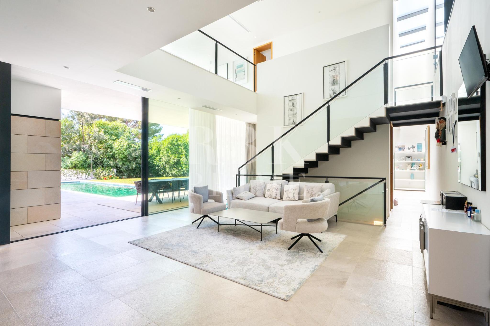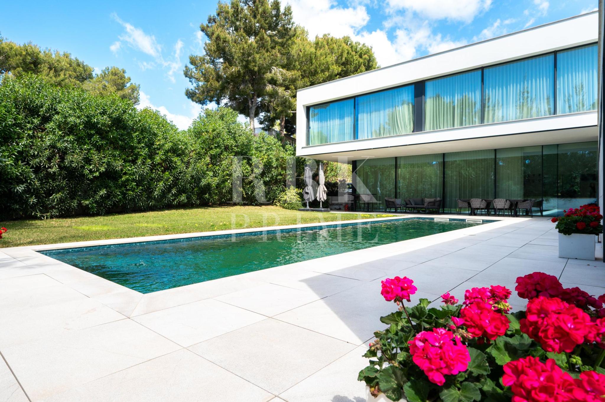 A spectacular modern villa situated in a highly sought-after area in the south-west of Mallorca, in Santa Ponsa. The property is spread over three floors, designed to be both functional and comfortable. The ground floor, with a floor area of 219 m², features a spacious living room with double-height ceilings, an open-plan kitchen-dining area, a TV room and two double bedrooms with en-suite bathrooms, as well as a utility room and a guest toilet. It connects to the outside via several porches totalling 51 m², ideal for enjoying the outdoors all year round. The first floor, measuring approximately 130 m² plus a porch with direct access from one of the bedrooms, houses the relaxation area with two double en-suite bedrooms and a lounge, ideal as a private or relaxation space. The basement offers a floor area of 223 m² and features a large versatile space, with an office and multiple possibilities: from a private gym and cinema room to any other use according to requirements. Outside, the property features a private garden, a 45 m² saltwater swimming pool and parking for 4–5 vehicles.