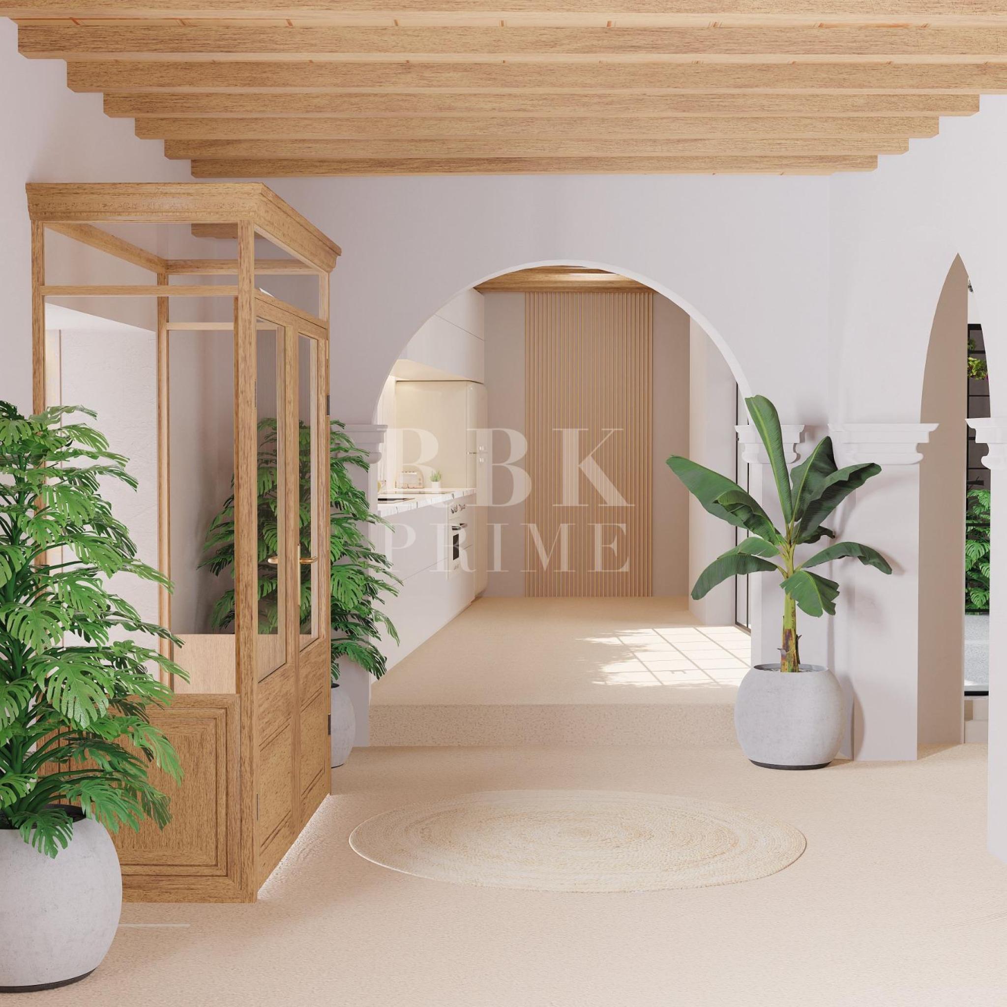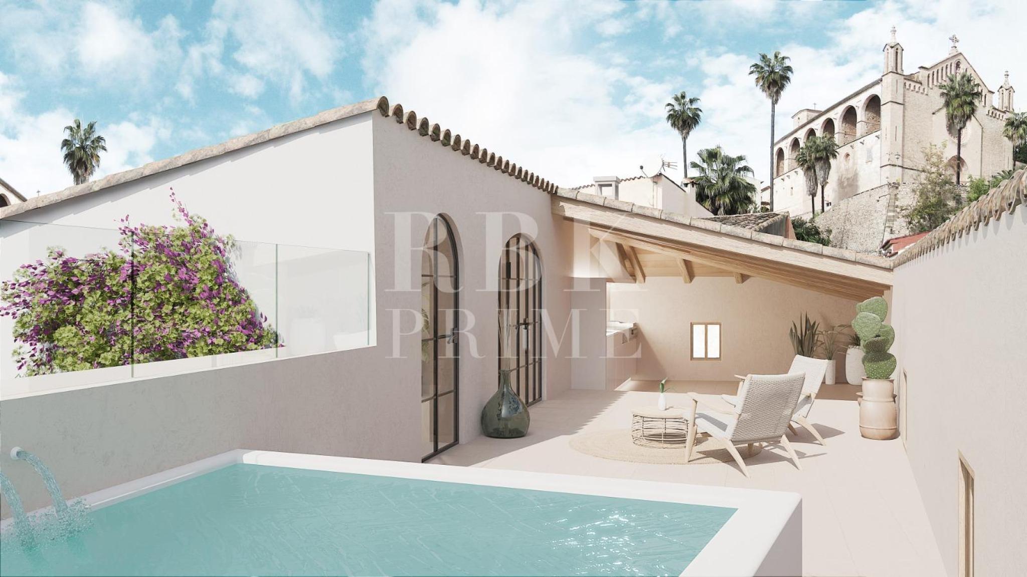 Manor house with swimming pool and views of the Santuari de Sant Salvador for sale, in the historic centre of Artà, one of the most charming villages in Mallorca. The property, completely renovated with top-quality traditional materials and modern finishes that maintain the Mallorcan essence, is distributed over 4 floors and features exposed wooden beams. On the main floor there is a living room with an integrated kitchen, the master bedroom with en-suite bathroom and a guest toilet. A large window connects to the interior courtyard, providing natural light and ventilation. The first floor has two double bedrooms, each with its own en-suite bathroom. On the top floor there is a bedroom with bathroom and a spectacular outdoor space with private swimming pool, barbecue area and a chill-out area from where you can enjoy magnificent views. The basement houses a cosy wine cellar and a garage of approximately 55 m² with capacity for two vehicles.