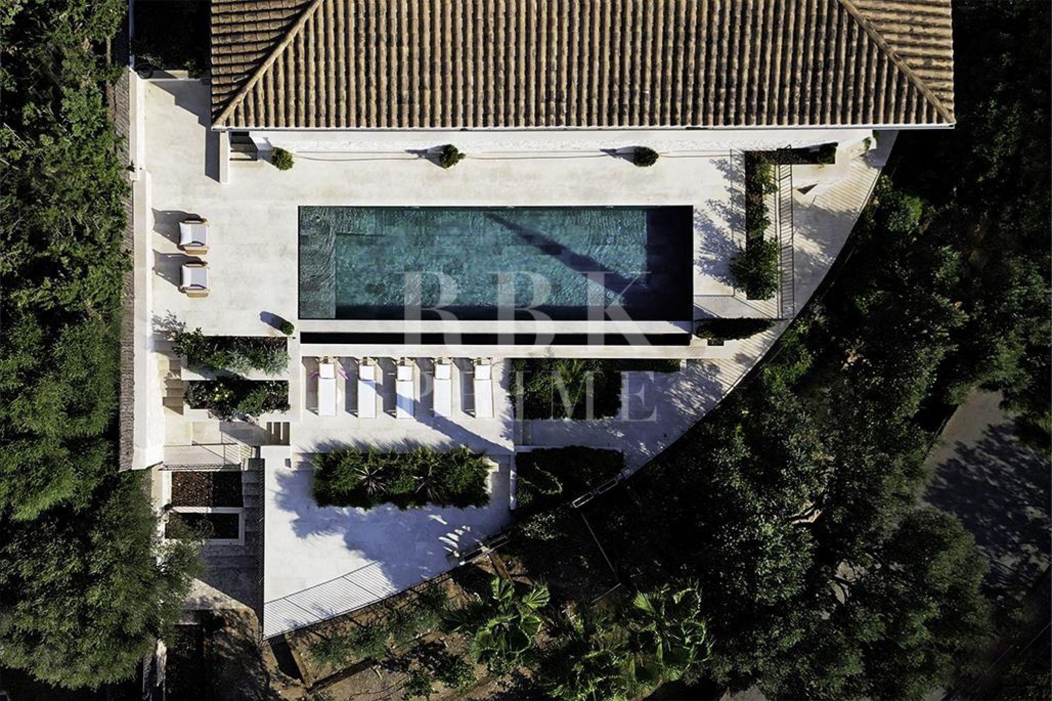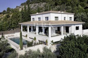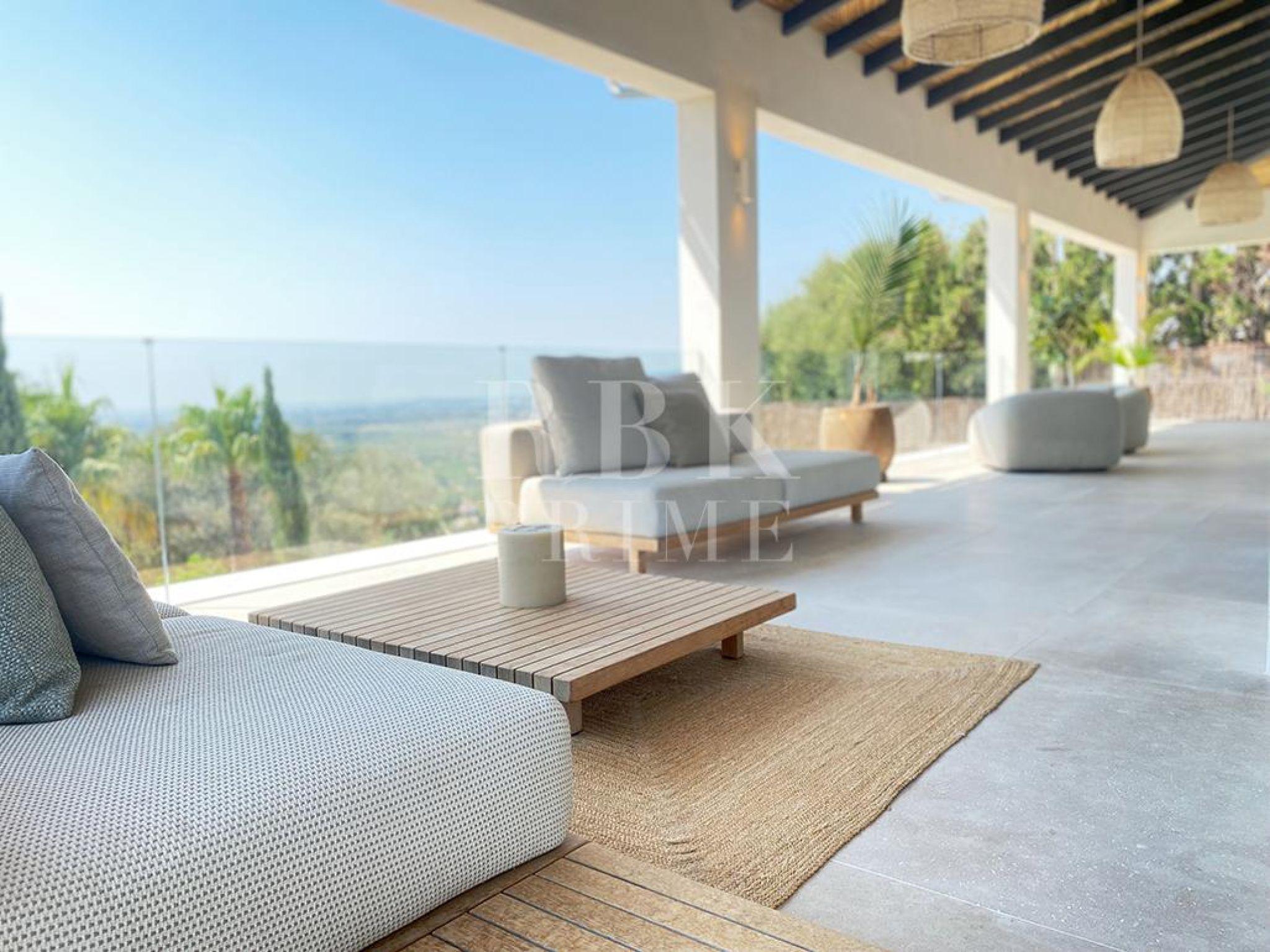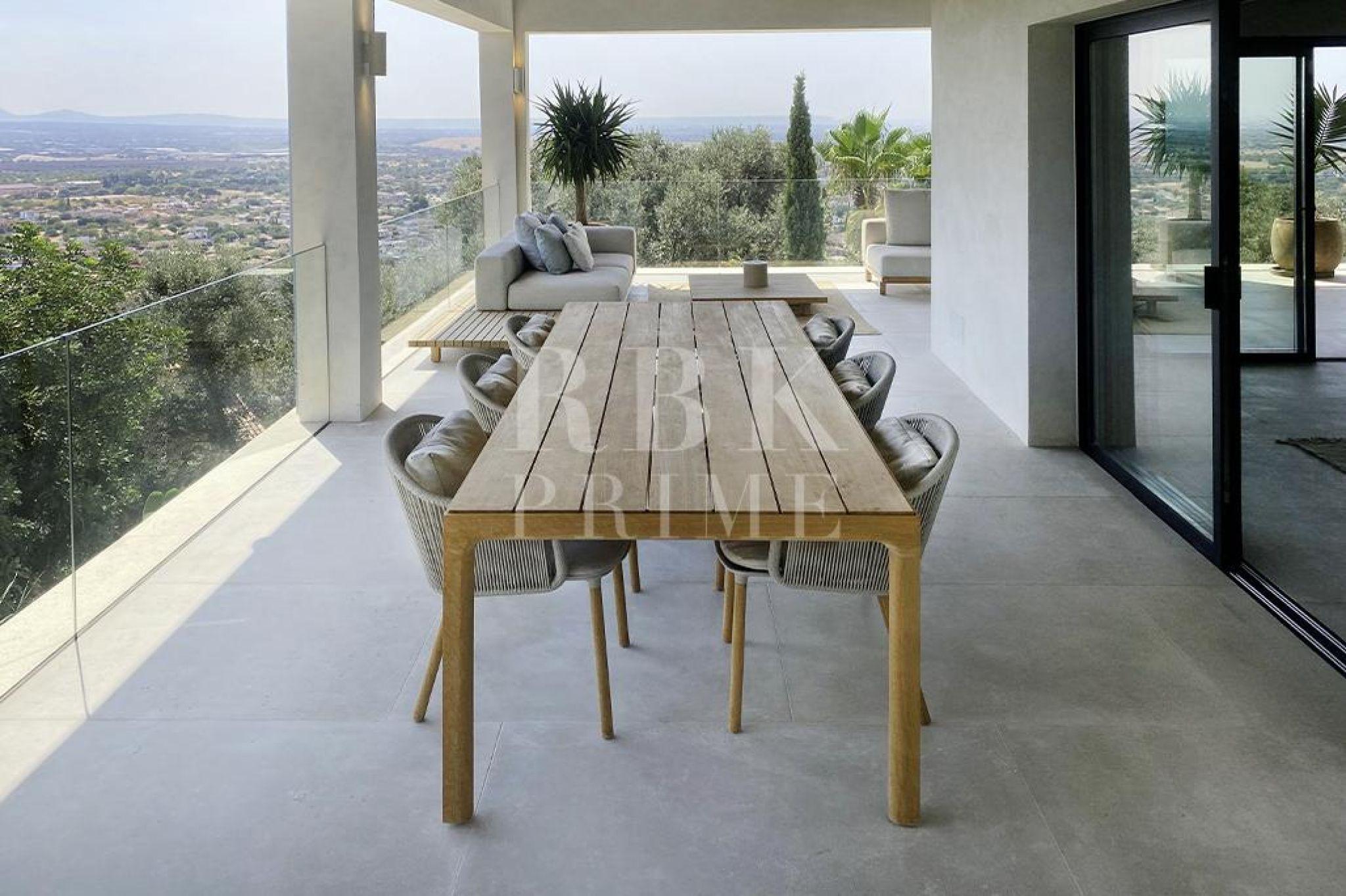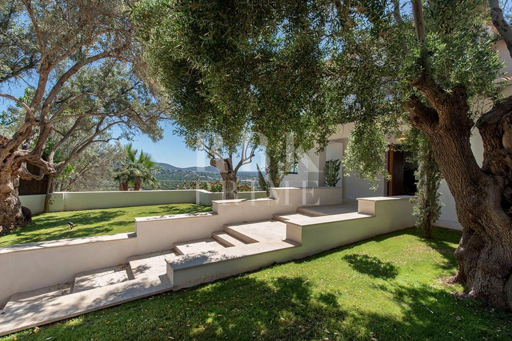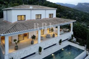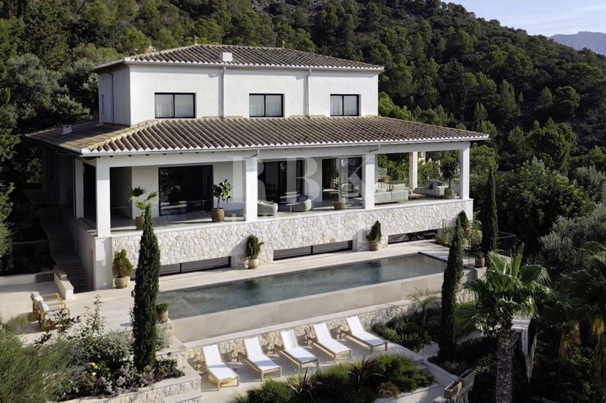 Exclusive villa for sale located in one of the most picturesque enclaves of Mallorca, in Bunyola, and boasts sweeping views of the bay of Palma and the Tramuntana mountains. The property, measuring approximately 750 m² on a plot of 1,680 m², has 5 bedrooms and 6 bathrooms, spread over three floors connected by a lift. Designed with serene elegance and natural materials, the house blends harmoniously into the landscape, creating a fluid connection between the interior and exterior spaces. The interior stands out for its spaciousness, high-quality finishes, and timeless palette colour scheme, which is designed to offer maximum comfort and functionality. The living areas open onto covered terraces with sea and mountain views, while the private areas are ideal for relaxation. The lower level comprises leisure and wellness areas with a spa and gym, offering direct access to the outdoors. Outside, there is a heated infinity pool facing the horizon, surrounded by a Mediterranean garden containing centuries-old olive and palm trees. Situated just 15 minutes from the centre of Palma, this villa offers the perfect combination of privacy, tranquillity, and proximity to the city, making it an elegant residence that captures the essence of the island.