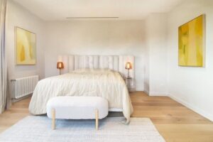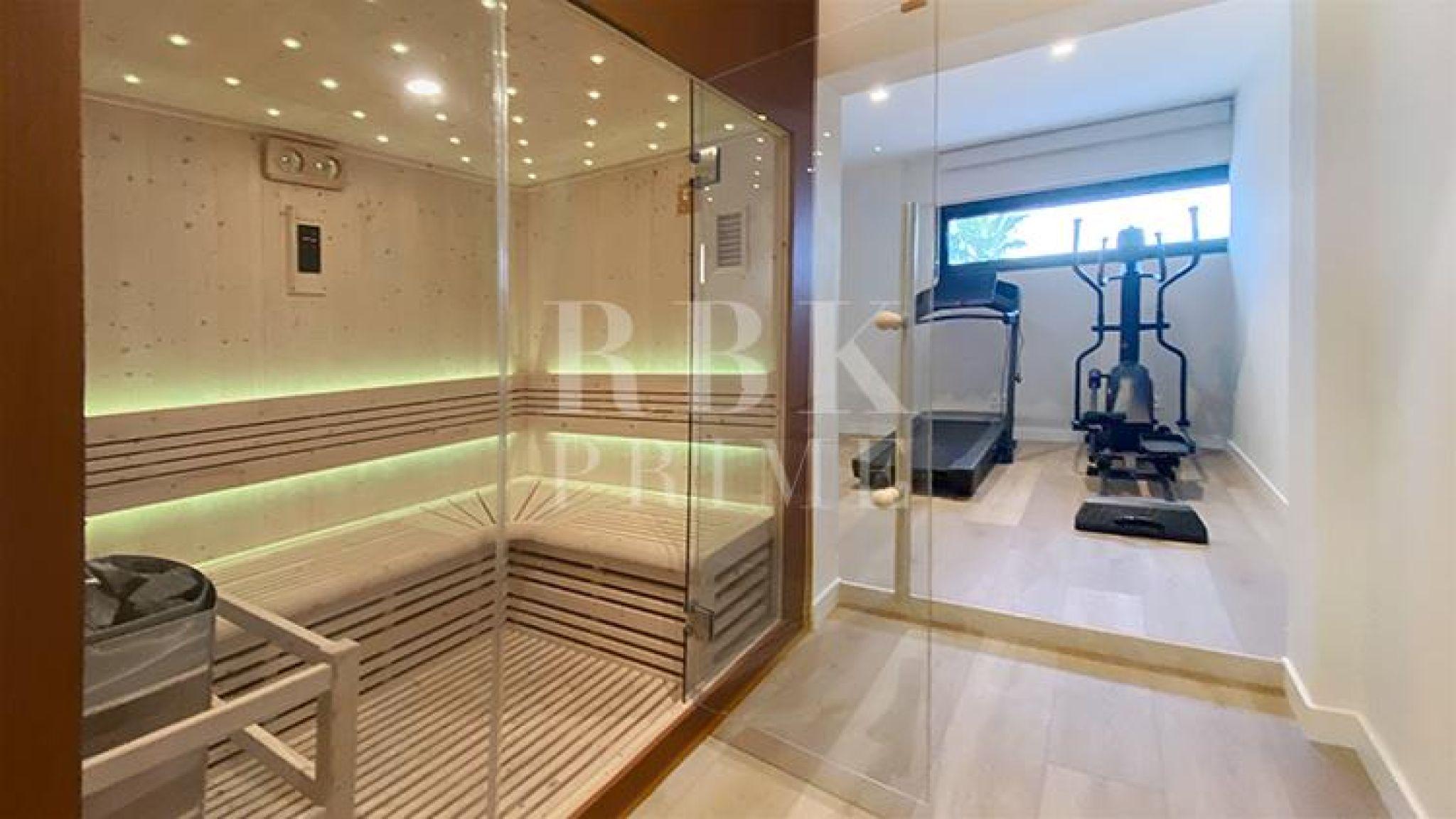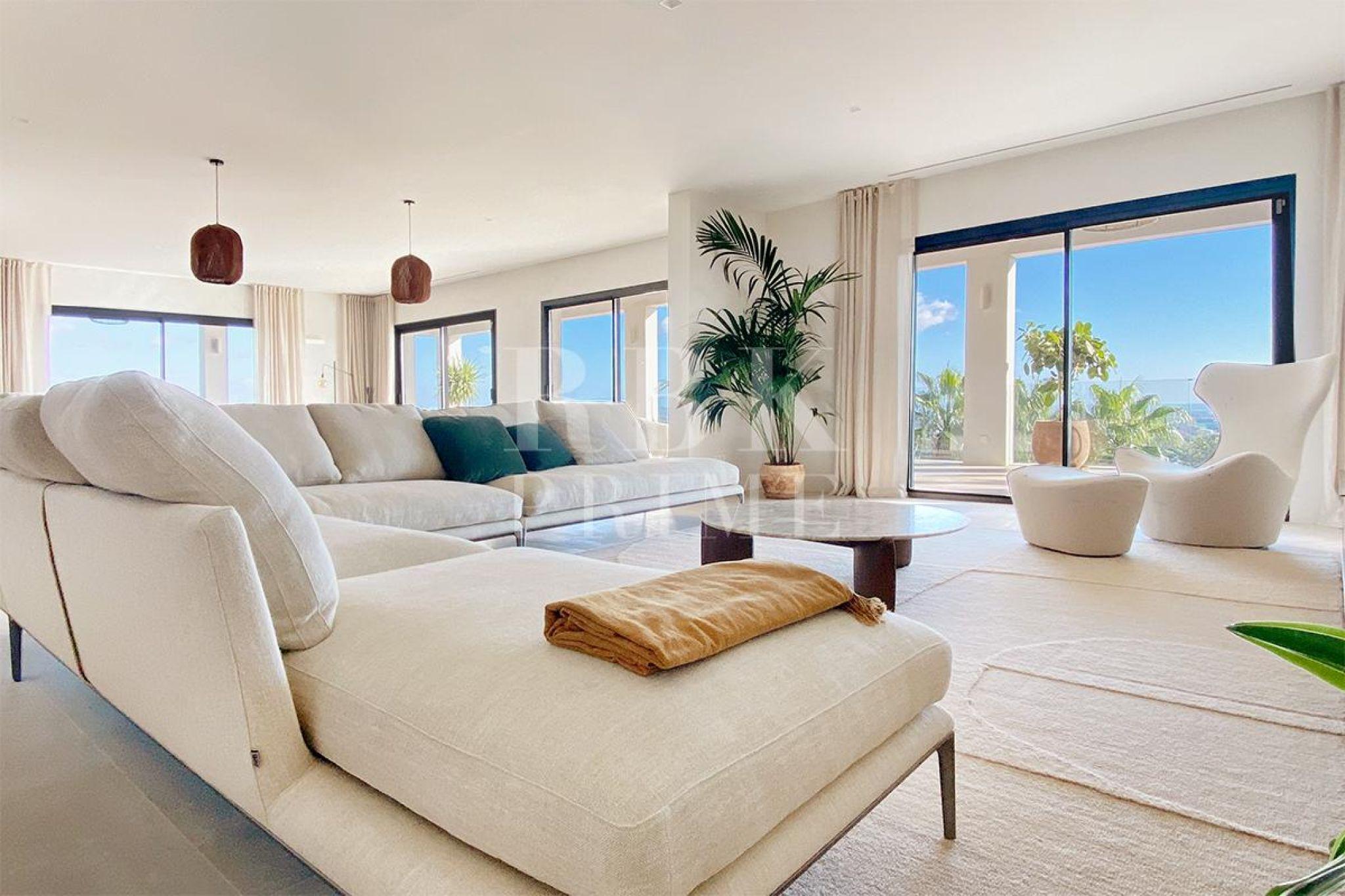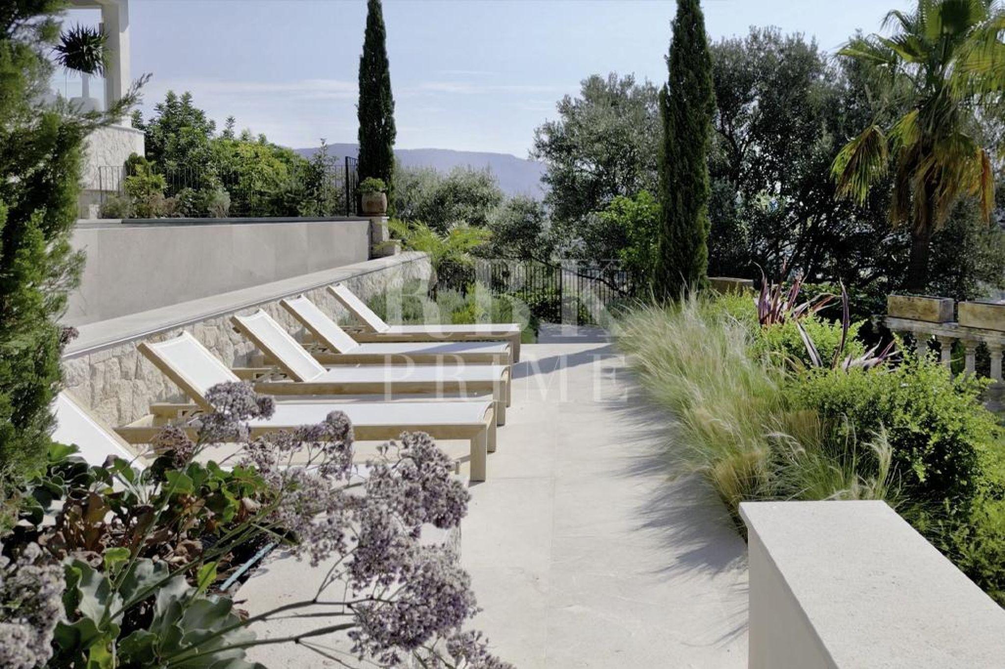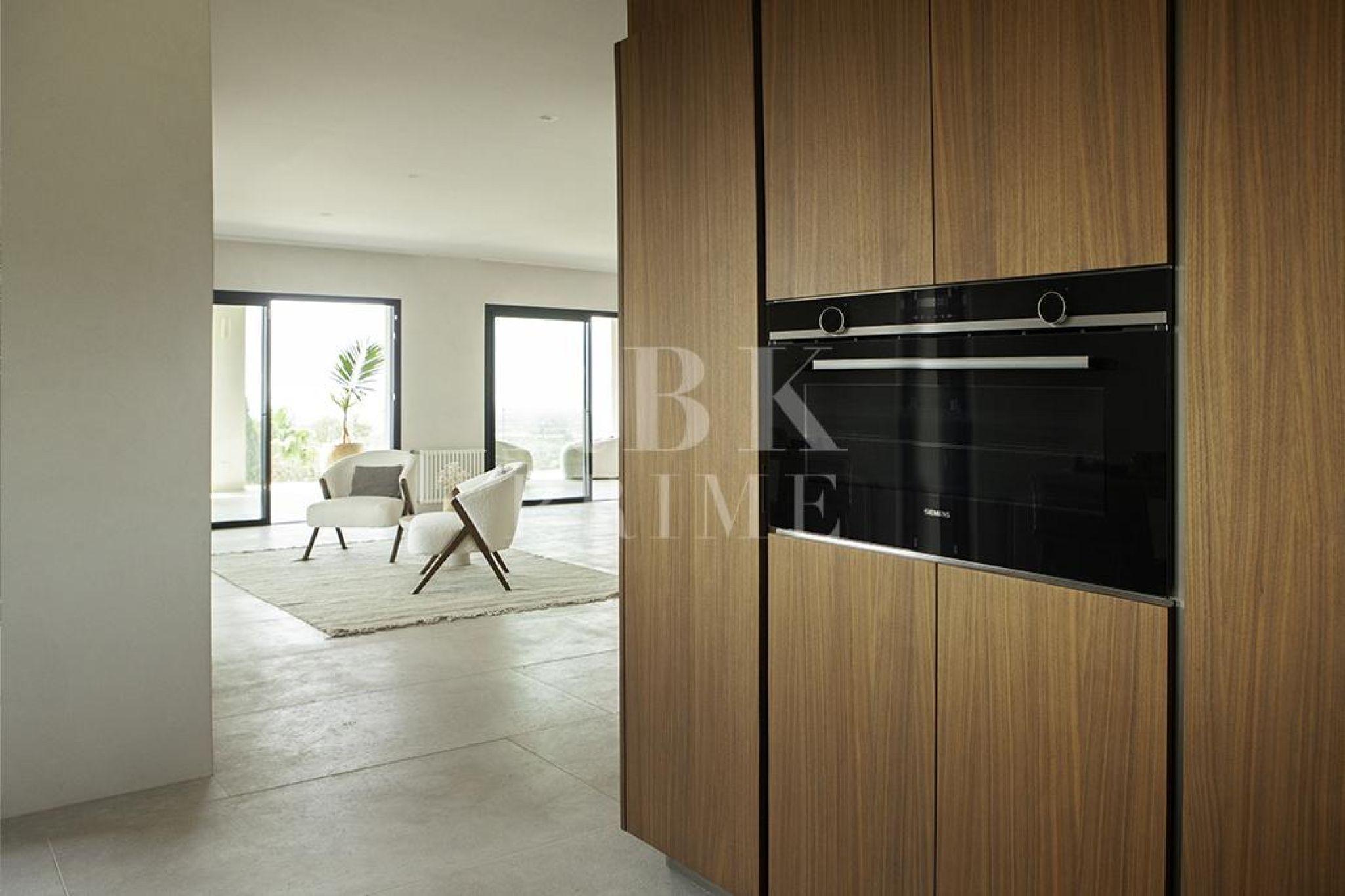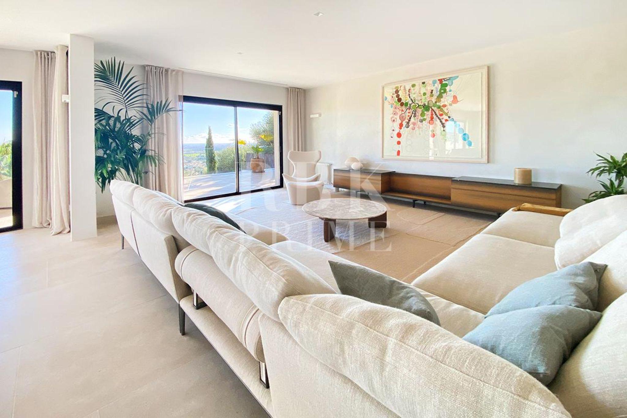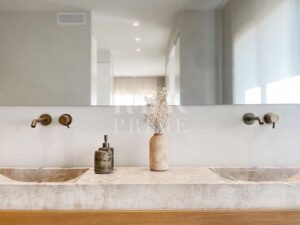 Exclusive villa for sale located in one of the most picturesque enclaves of Mallorca, in Bunyola, and boasts sweeping views of the bay of Palma and the Tramuntana mountains. The property, measuring approximately 750 m² on a plot of 1,680 m², has 5 bedrooms and 6 bathrooms, spread over three floors connected by a lift. Designed with serene elegance and natural materials, the house blends harmoniously into the landscape, creating a fluid connection between the interior and exterior spaces. The interior stands out for its spaciousness, high-quality finishes, and timeless palette colour scheme, which is designed to offer maximum comfort and functionality. The living areas open onto covered terraces with sea and mountain views, while the private areas are ideal for relaxation. The lower level comprises leisure and wellness areas with a spa and gym, offering direct access to the outdoors. Outside, there is a heated infinity pool facing the horizon, surrounded by a Mediterranean garden containing centuries-old olive and palm trees. Situated just 15 minutes from the centre of Palma, this villa offers the perfect combination of privacy, tranquillity, and proximity to the city, making it an elegant residence that captures the essence of the island.