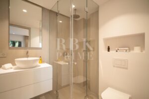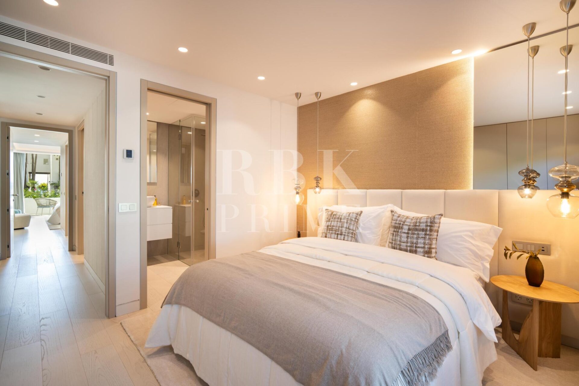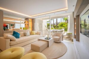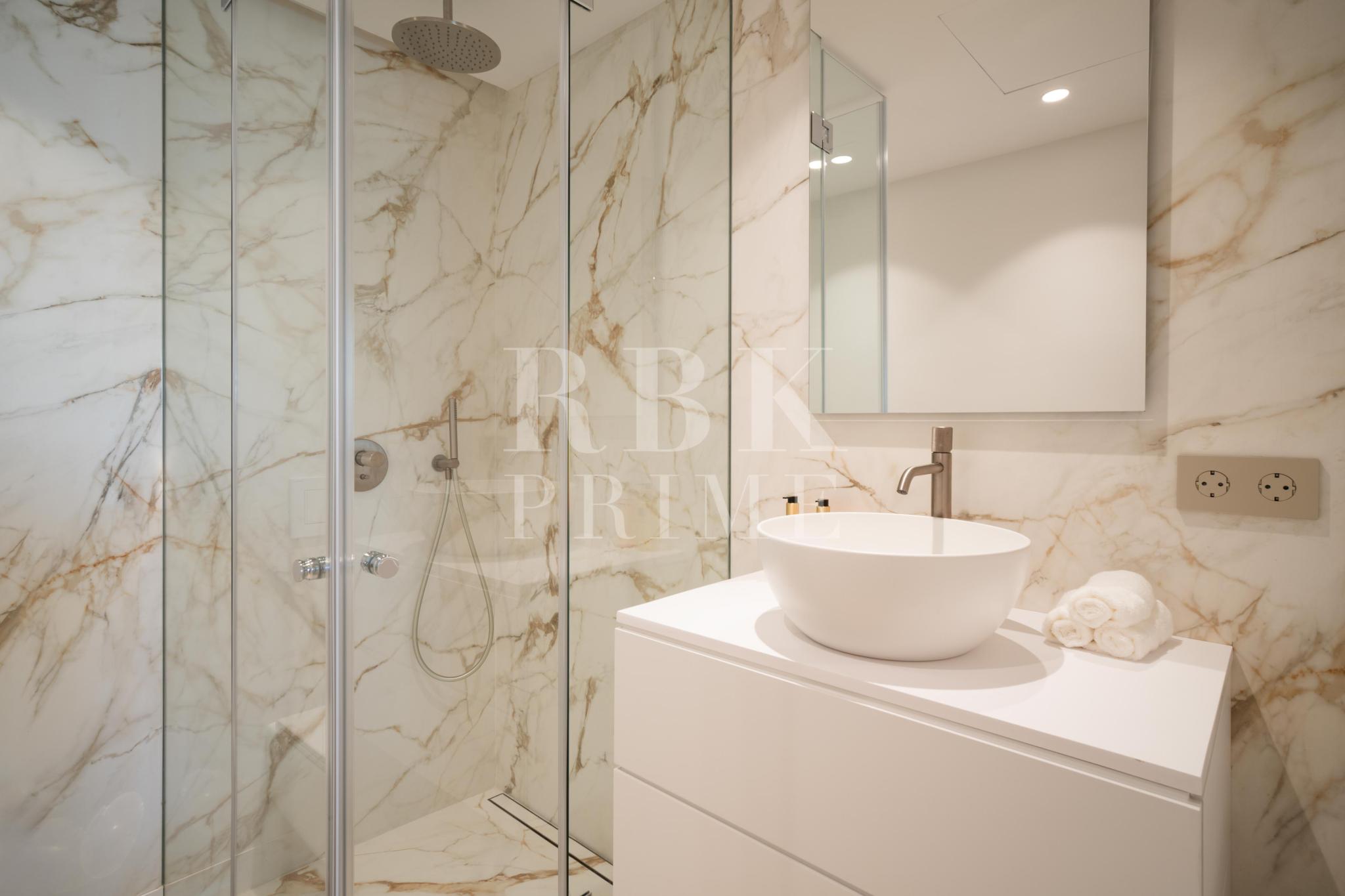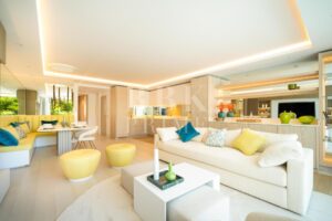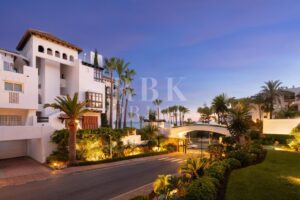 Elegante apartamento en venta situado dentro de la prestigiosa comunidad frente al mar en la Milla de Oro de Marbella. Esta residencia bellamente diseñada se encuentra en un solo nivel, cuenta con aproximadamente 152 m² de superficie construida y captura la esencia de un estilo de vida mediterráneo. La propiedad dispone de tres dormitorios, cada uno con baño en suite, incluido el dormitorio principal, que cuenta con una amplia terraza. El piso conecta a la perfección los espacios interiores y exteriores. Puertas correderas de suelo a techo conectan la terraza con el salón-comedor y la cocina, creando un ambiente luminoso y aireado. El acogedor comedor, situado junto a la moderna y elegante cocina, con amplio espacio de almacenamiento y modernos electrodomésticos, confiere al apartamento un ambiente encantador, que se complementa con una zona de bar. Las características adicionales incluyen calefacción por suelo radiante, aire acondicionado, domótica avanzada a través de KNX y sistema de sonido integrado. Situado a pocos pasos de la playa y de las exclusivas comodidades del complejo, esta propiedad ofrece un estilo de vida privilegiado en una de las zonas más codiciadas de Marbella.