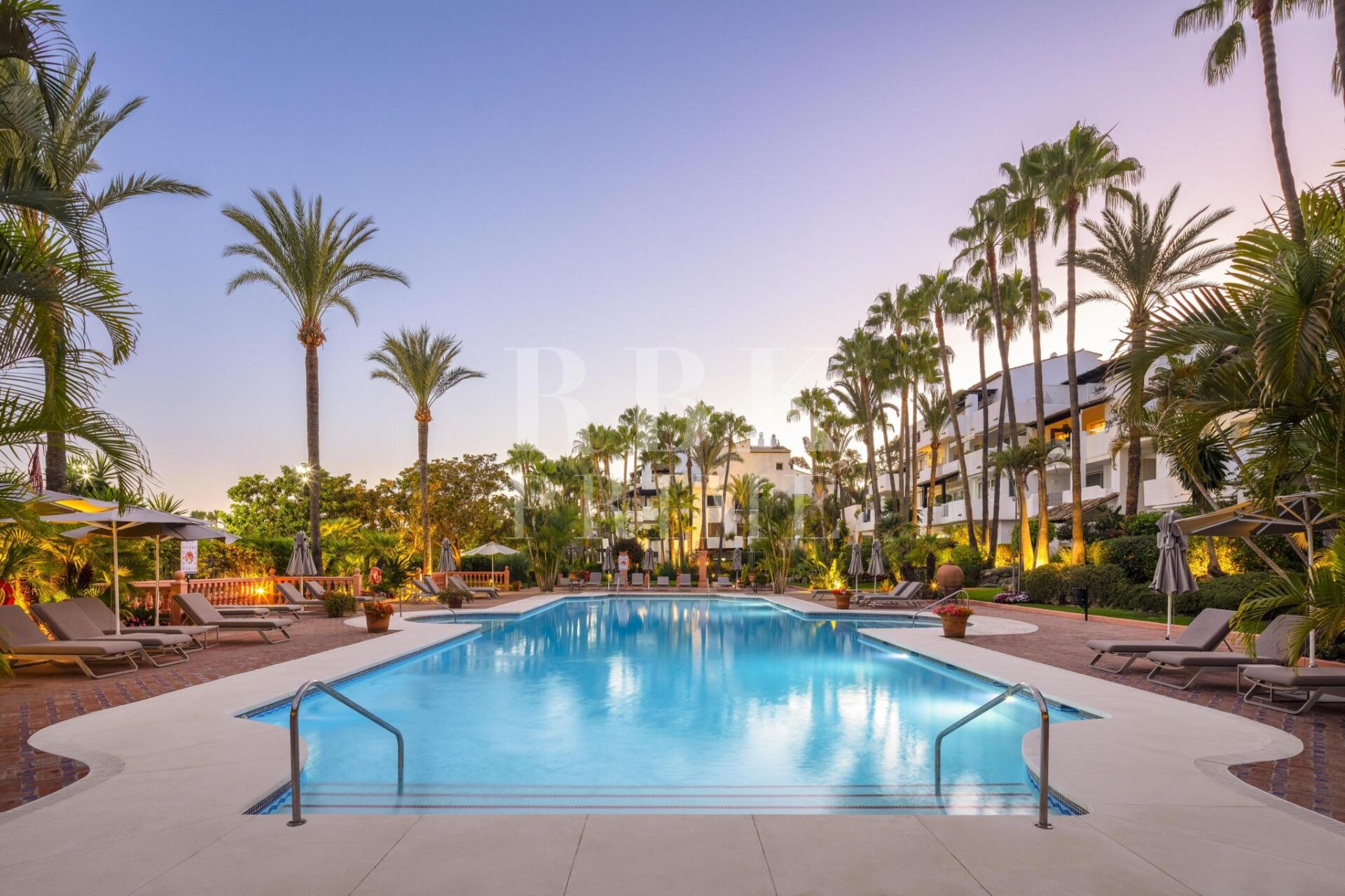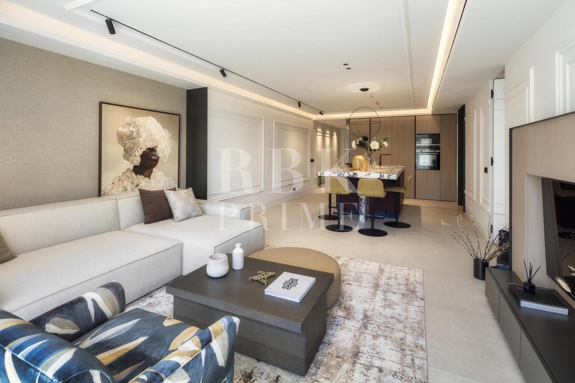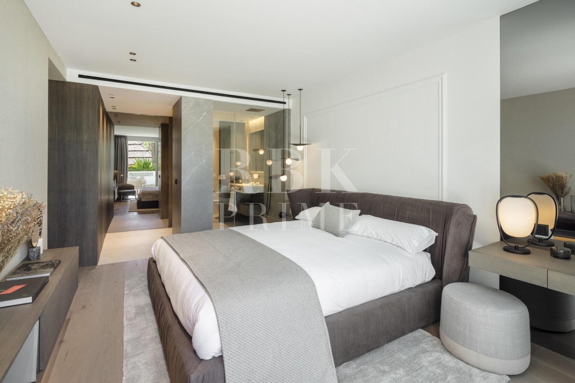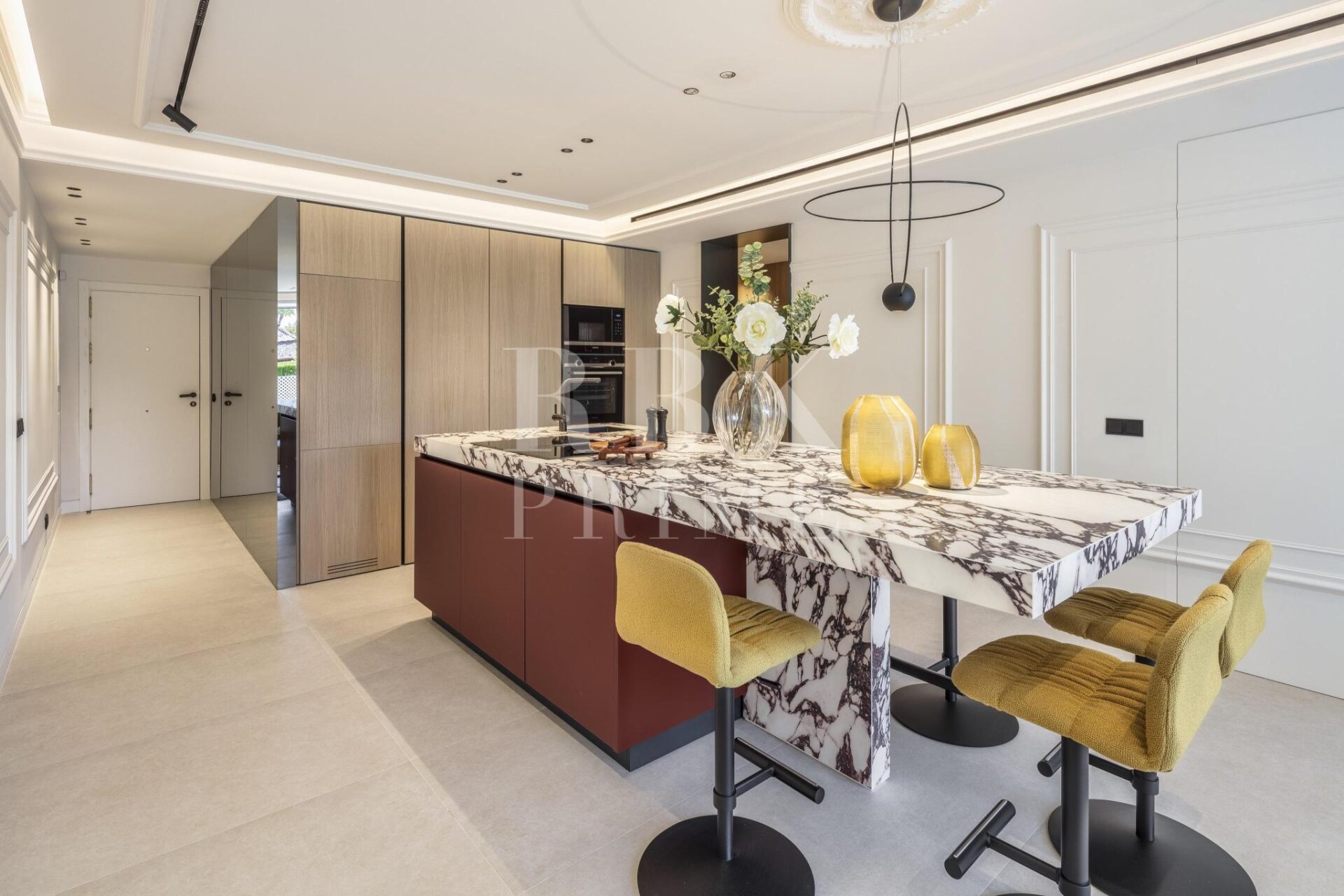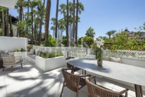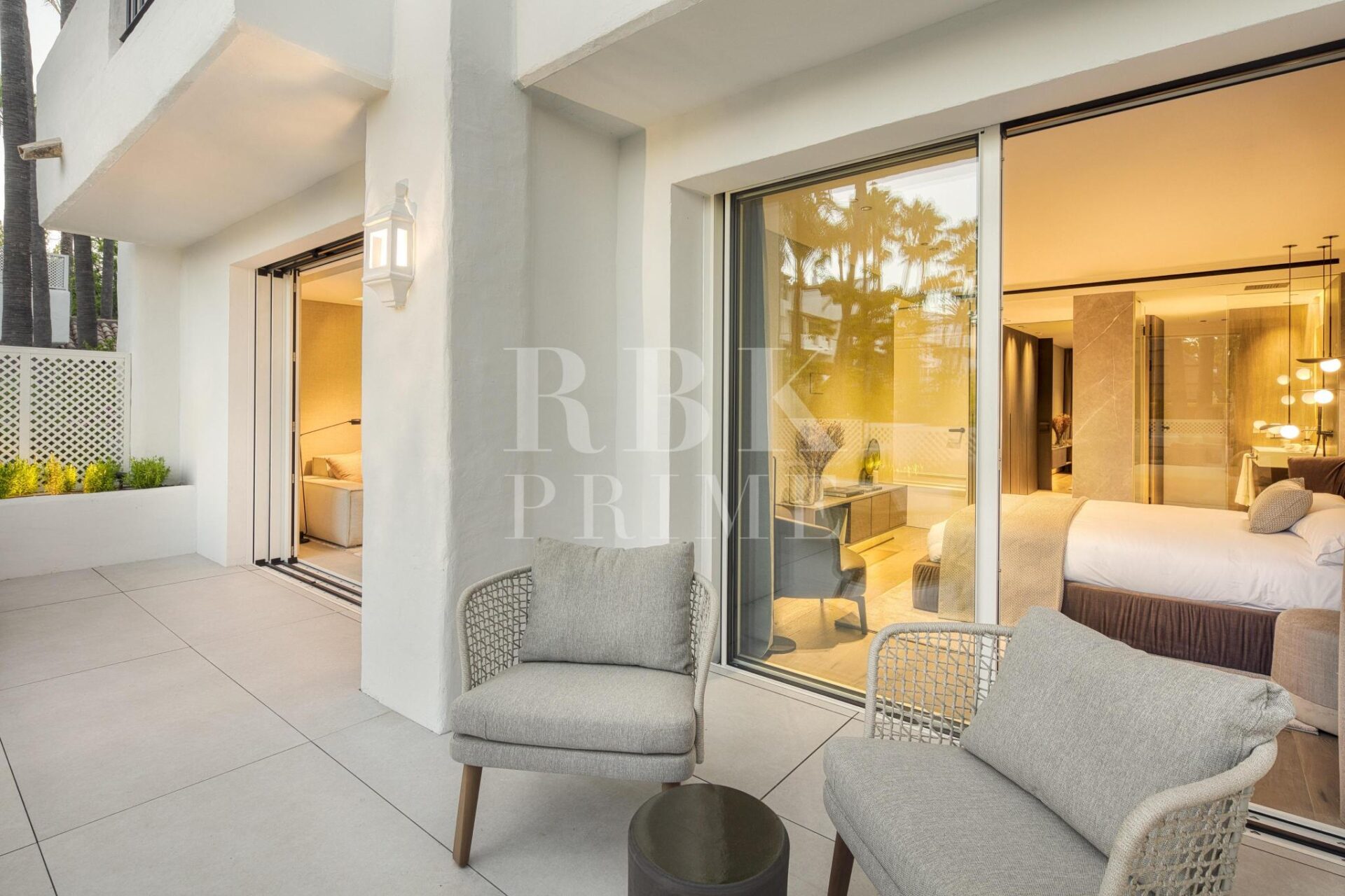 Exquisito apartamento en venta en la planta baja, recientemente reformado y ubicado en una de las zonas más exclusivas de la Milla de Oro de Marbella. Con una superficie construida de 118 m², esta propiedad combina lujo, diseño moderno y funcionalidad, y ofrece un estilo de vida tipo resort a pocos pasos del mar y de todos los servicios. La vivienda tiene 3 dormitorios, todos con suelos de madera natural, armarios empotrados, aire acondicionado independiente y baños en suite con calefacción por suelo radiante y accesorios de calidad. El dormitorio principal tiene acceso a la terraza y está diseñado con atención al detalle. Esta cuenta con una zona de comedor y asientos al aire libre, vistas de los alrededores y una buena orientación soleada. Los materiales y acabados son de la más alta calidad, las ventanas panorámicas de aluminio proporcionan acceso directo a la terraza e inundan la casa de luz natural. La cocina a medida está totalmente equipada con electrodomésticos Siemens nuevos y cuenta con una impresionante encimera de mármol en la isla. El apartamento ofrece fácil acceso a la Milla de Oro, sus servicios y la playa, permitiendo a los residentes sumergirse plenamente en lo que Marbella tiene para ofrecer.