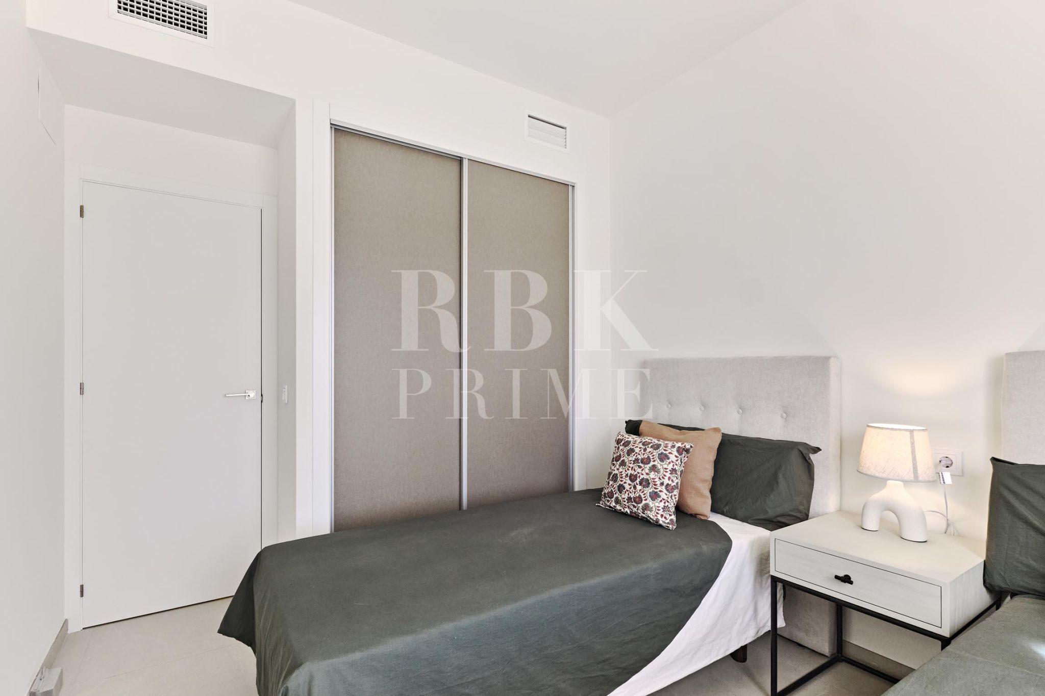 Exclusivo ático en venta en una promoción de obra nueva en Torrevieja (Alicante), situada a tan solo 250 metros del mar. La vivienda, con una superficie construida de 103 m², cuenta con 2 dormitorios y 2 baños, uno de ellos en suite. La cocina de concepto abierto se integra con el salón, creando un espacio luminoso y funcional. Desde el salón y ambos dormitorios se accede directamente a una terraza. Además, dispone de un espectacular solárium privado de 76 m², con las vistas al mar, ideal para disfrutar del clima mediterráneo. La orientación sureste garantiza una excelente entrada de luz natural. El ático está equipado con materiales de primera calidad, como suelo radiante eléctrico en los baños, sistema de aerotermia para la producción de agua caliente sanitaria (ACS) y climatización frío-calor, que garantizan un alto nivel de confort y eficiencia energética durante todo el año. La propiedad incluye una plaza de aparcamiento y un trastero. Es una excelente opción tanto como residencia habitual como segunda vivienda o inversión, ya que combina diseño moderno, confort y espacios exteriores privados en una ubicación privilegiada cerca del mar.