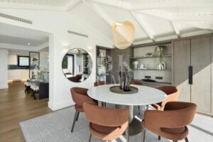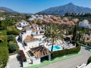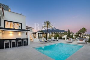 Lujosa villa recién reformada en venta en la exclusiva y segura urbanización de Nueva Andalucía, Málaga. Ubicado en una parcela de 962 m², la propiedad cuenta con vistas panorámicas de la montaña de La Concha y el mar Mediterráneo. Con una superficie construida de 239 m², esta residencia impresiona por su equipamiento de alta calidad, su arquitectura moderna y su estudiada distribución de las estancias. El interior de la villa está inundado de luz y cuenta con un diseño elegante. La propiedad cuenta con 5 dormitorios, incluyendo un dormitorio principal con terraza privada y vistas impresionantes de los alrededores. El salón-comedor de planta abierta da acceso directo a la terraza. La moderna cocina, equipada con electrodomésticos de última generación, combina funcionalidad con atractivo estético, y ofrece amplio espacio de almacenamiento y una encimera para mayor comodidad. La zona exterior incluye un cuidado jardín, una cocina exterior con barbacoa y zona de bar, así como varias zonas de terraza y salón. También hay una piscina exterior para relajarse. Se trata de una villa encantadora, tranquila y segura, con una ubicación céntrica cerca de campos de golf y Puerto Banús.