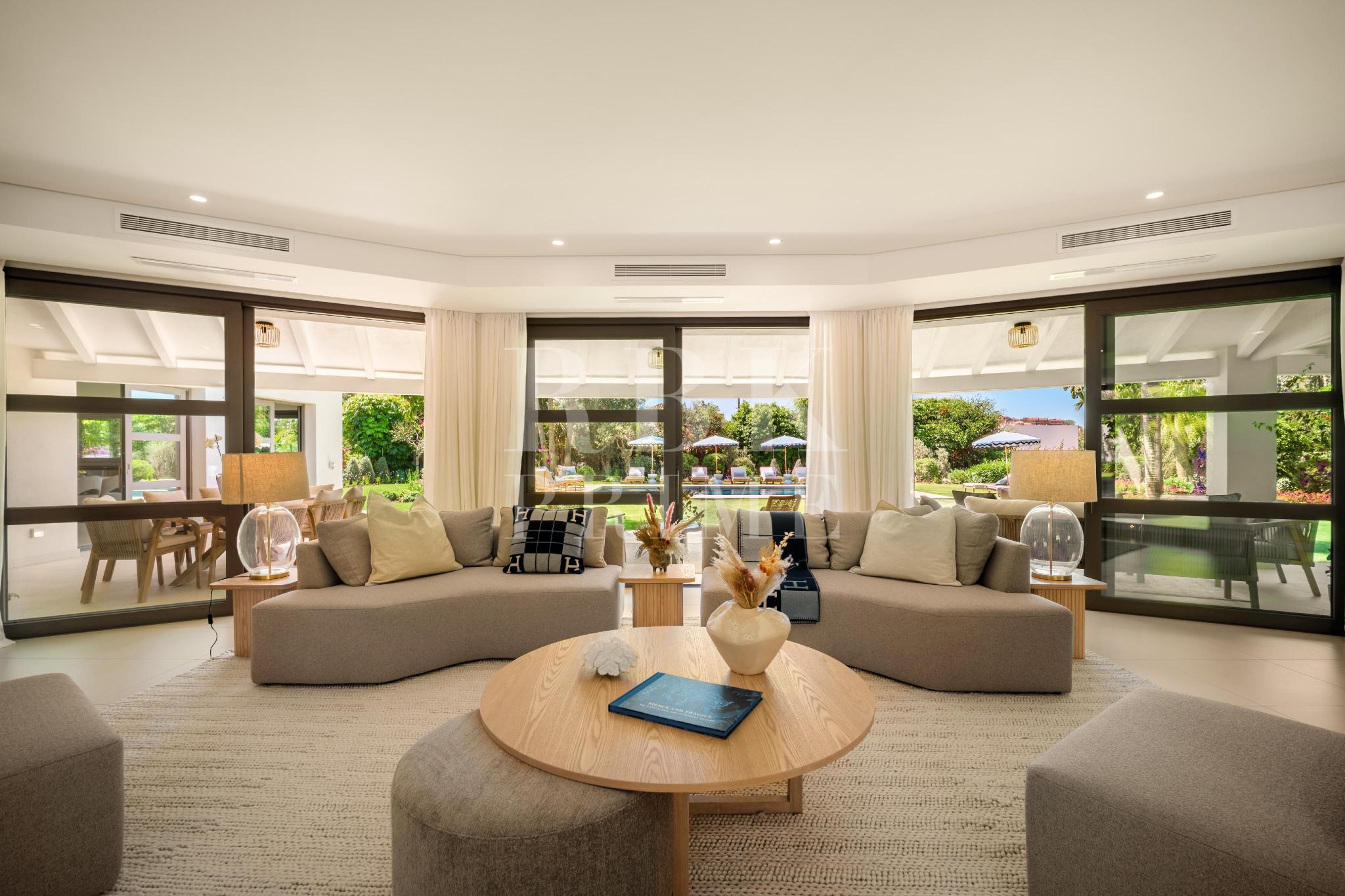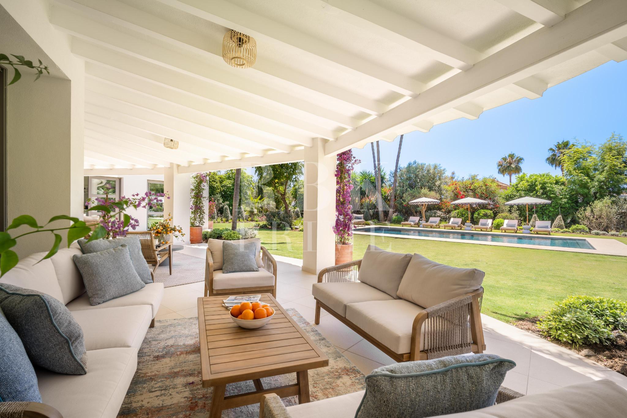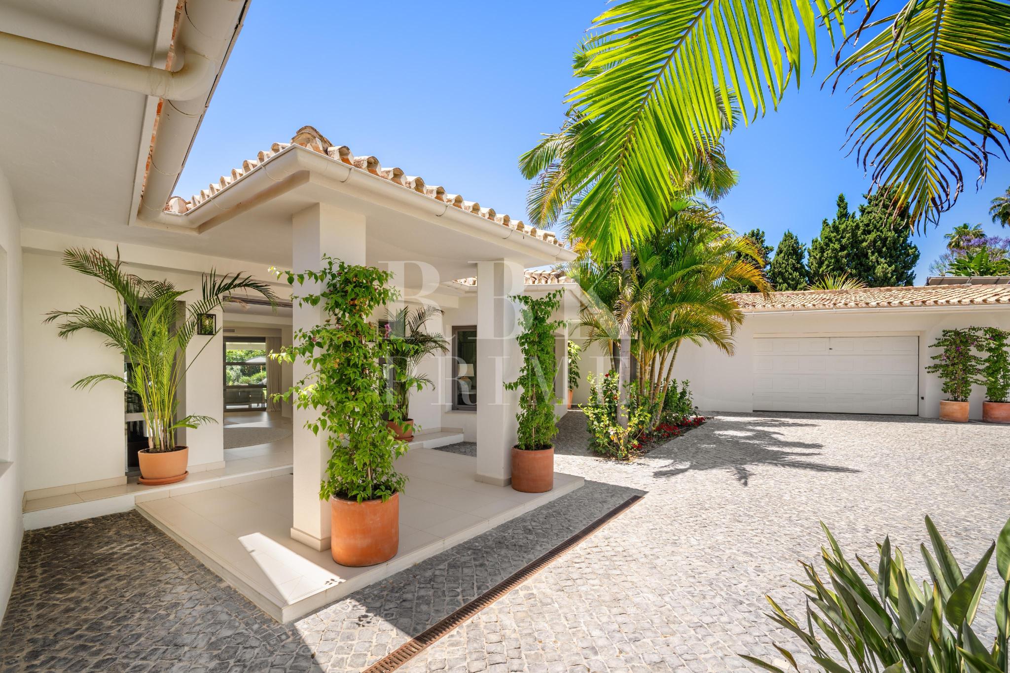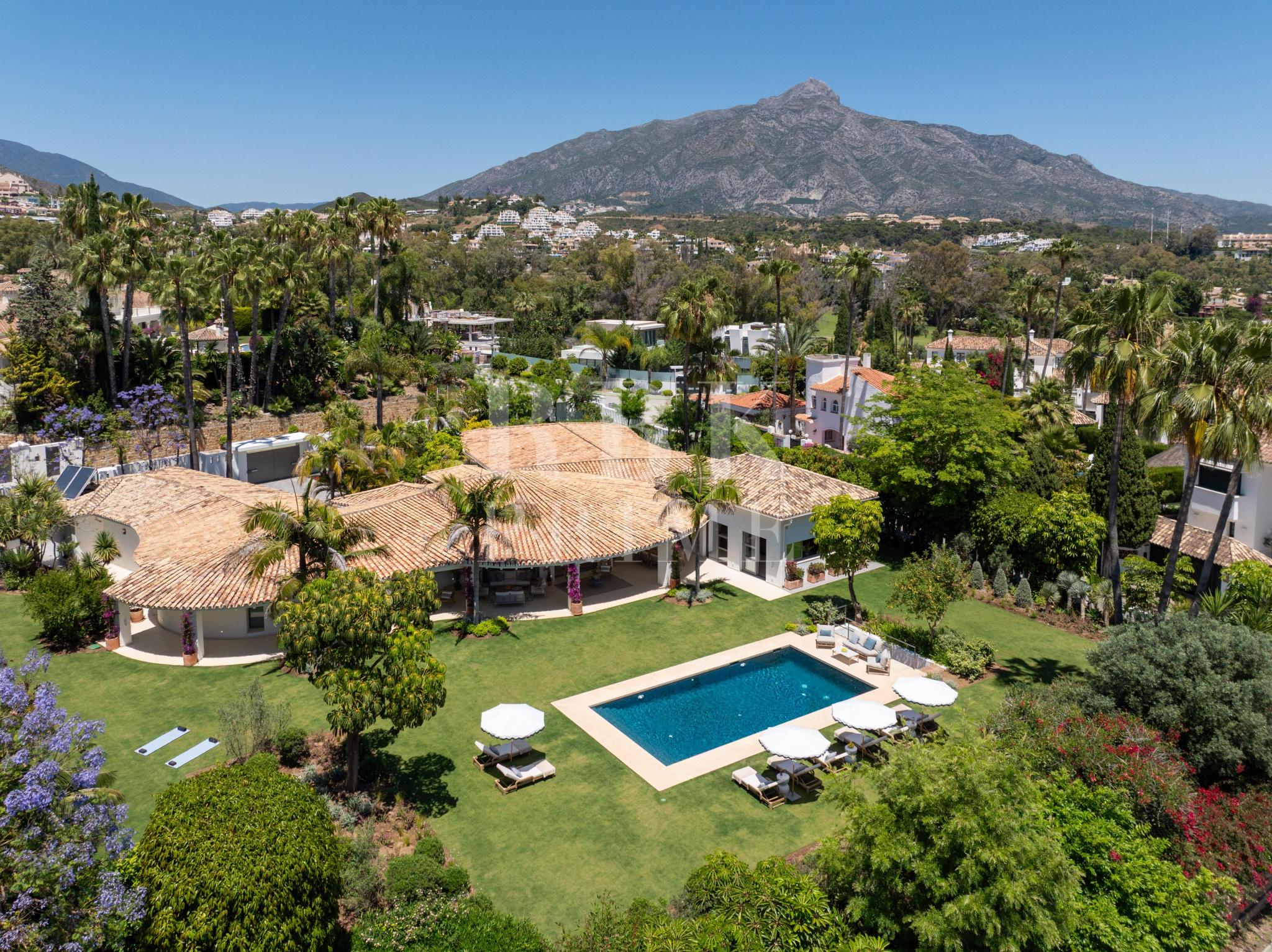 Exclusivo bungaló de lujo en venta, situado en una de las parcelas originales del prestigioso enclave de La Cerquilla, en Nueva Andalucía. Construida durante las primeras etapas del desarrollo de La Cerquilla, esta elegante villa de 603 m² de una sola planta está situada en una generosa parcela llana de 3.062 m², ofreciendo total privacidad, vistas parciales al golf y una envidiable orientación sur. Totalmente renovada en 2024, la villa combina a la perfección el encanto arquitectónico atemporal con el refinamiento contemporáneo. El interior consta de 5 espaciosos dormitorios en suite, un aseo de invitados, dos amplios salones, una elegante cocina Danespan con isla central, dos comedores, un despacho y una biblioteca. Otras características incluyen un garaje para 4 vehículos, ventanas de seguridad Technal, iluminación Lutron y un depósito de agua. Los jardines, profesionalmente ajardinados, exudan exuberancia y exclusividad, y crean un ambiente sereno para la vida al aire libre. Una terraza cubierta envolvente, una piscina de nueva construcción y espacios de vida de planta abierta proporcionan una conexión perfecta entre las zonas interiores y exteriores. Esta distinguida propiedad es una residencia emblemática que encarna la evolución de Marbella hacia un destino de lujo internacional de primer orden.