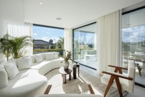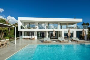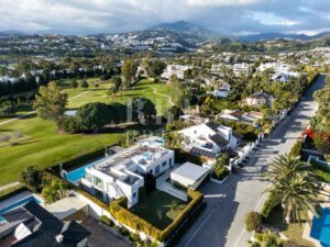 Moderna villa en venta de primera línea de golf, situada en Nueva Andalucía, Málaga, es ideal para quienes que buscan una propiedad de alta calidad en una de las zonas más cotizadas de Marbella. Esta villa combina a la perfección una arquitectura contemporánea, un diseño funcional y acabados de primera calidad, y ofrece vistas abiertas al campo de golf y a las montañas circundantes. En el interior, la villa tiene una distribución luminosa de planta abierta con un amplio salón y comedor que comunica con una moderna cocina totalmente equipada. La propiedad cuenta con 6 dormitorios, el dormitorio principal tiene acceso directo a la terraza y cuenta con un amplio cuarto de baño acabado con materiales de alta calidad. Las zonas exteriores están cuidadosamente diseñadas para la relajación y el entretenimiento, y cuentan con amplias terrazas, piscina, zona de solárium en la azotea con jacuzzi y camino privado para coches, lo que proporciona mayor comodidad y privacidad. Las instalaciones adicionales incluyen un gimnasio y una sala de cine privada. Situada cerca de los principales campos de golf, escuelas internacionales, restaurantes y a pocos minutos de Puerto Banús, esta villa es una excelente oportunidad para disfrutar de la comodidad, la privacidad y el lujo del estilo de vida de Marbella.