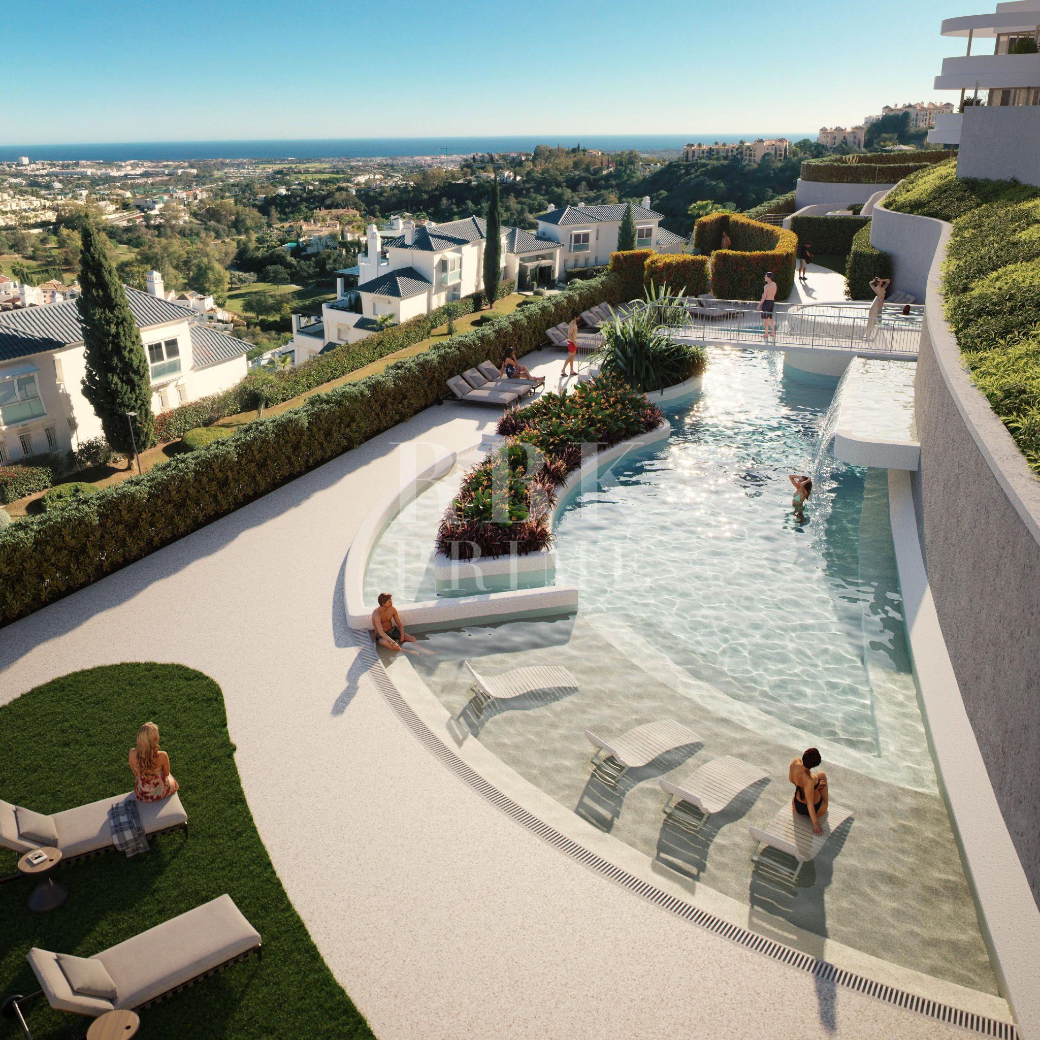 Exclusivo apartamento a estrenar en venta en planta baja, situado en una de las promociones más prestigiosas de la zona entre Marbella y Benahavís. Esta elegante promoción combina diseño contemporáneo, confort y vistas al mar, y ofrece un estilo de vida de lujo incomparable en la Costa del Sol. Con 128 m² de superficie interior y una gran terraza con jardín y piscina privados, la vivienda integra a la perfección los espacios interiores y exteriores, ideales para relajarse y disfrutar de las puestas de sol. El salón-comedor luminoso, con cocina de concepto abierto equipada con electrodomésticos Miele, se conecta directamente con la terraza y el jardín. Dispone de 2 dormitorios con baño en suite y un aseo adicional, destacando la suite principal por su amplitud y su elegante baño de diseño. La vivienda incluye suelo radiante en toda la vivienda, una plaza de garaje y un trastero. La urbanización ofrece amenidades de 5 estrellas: piscinas interiores y exteriores, spa, gimnasio, health club, área de yoga y meditación, zona infantil, petanca, business centre y seguridad 24 horas. Se trata de una oportunidad única de inversión en una promoción boutique que redefine el lujo y la exclusividad en la Costa del Sol. Las imágenes son renders y la información corresponde al proyecto del promotor.