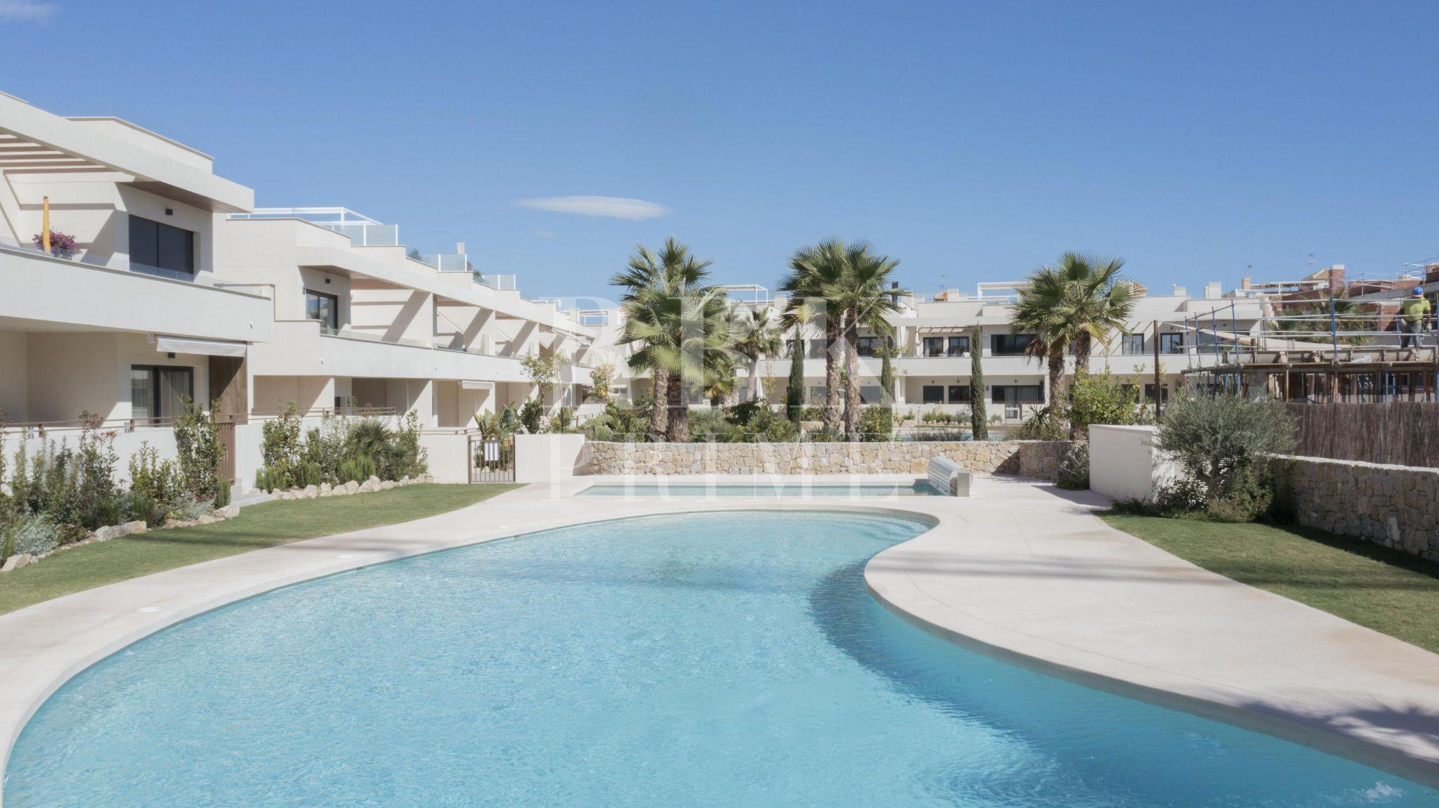 Elegante apartamento de planta baja en venta en una exclusiva promoción de obra nueva en Torrevieja (Alicante), situada a solo 250 m del mar. La vivienda con una superficie construida de 98 m², cuenta con 2 dormitorios y 2 baños, uno de ellos en suite. La cocina de concepto abierto se integra armoniosamente con el amplio salón, creando un espacio luminoso y funcional. Desde el salón y ambos dormitorios se accede directamente a una amplia terraza que se prolonga hacia un jardín privado de 37 m², ideal para disfrutar del clima mediterráneo. La orientación sur garantiza una óptima entrada de luz natural durante todo el día. El apartamento está equipado con materiales de primera calidad, como suelo radiante eléctrico en los baños, sistema de aerotermia para la producción de agua caliente sanitaria (ACS) y climatización frío-calor, que garantizan un alto nivel de confort y eficiencia energética durante todo el año. La propiedad incluye una plaza de aparcamiento y un trastero. Es una excelente opción tanto como residencia habitual como segunda vivienda o inversión, ya que combina diseño moderno, confort y espacios exteriores privados en una ubicación privilegiada cerca del mar.