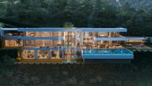 Villa de lujo en venta en una de las comunidades cerradas más exclusivas de Benahavís, Málaga. Esta vivienda de obra nueva se encuentra en una parcela de 3.757 m² y ofrece 1.107 m² de superficie construida con vistas panorámicas al Mediterráneo y las montañas. Se distribuye en 3 niveles conectados por ascensor. La planta baja incluye una zona de bienestar con piscina climatizada, spa, gimnasio, cine, bodega, sala de ocio con bar y dos dormitorios. En la planta principal hay 2 dormitorios en suite, amplias zonas de estar y una cocina de diseño con electrodomésticos de alta gama y acabados en piedra natural. En la planta superior hay 3 dormitorios más, cada uno con terraza privada, incluida una gran suite principal con vestidor y baño tipo spa. También dispone de despacho y biblioteca. Las zonas principales se abren a terrazas, jardines y una piscina infinita de agua salada con jacuzzi, una zona hundida, elementos de agua, un comedor exterior y una cocina al aire libre, ideales para relajarse o recibir invitados. Entre sus extras: carpintería de nogal, suelo radiante, climatización por aerotermia, sistema domótico Control4, seis plazas de aparcamiento con cargador para coche eléctrico y calificación energética A. La villa se vende completamente amueblada y combina diseño, confort y privacidad en una ubicación privilegiada.