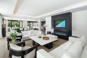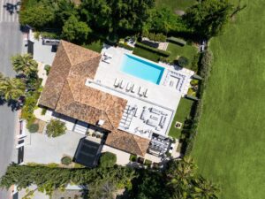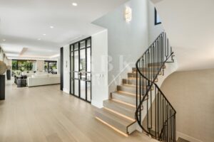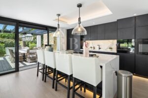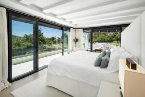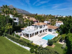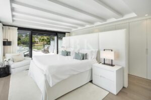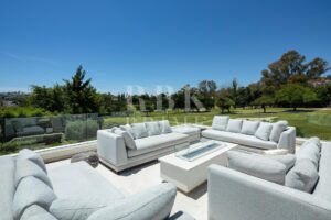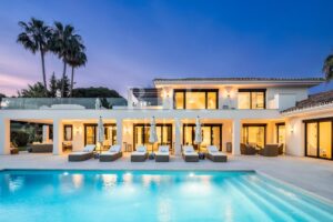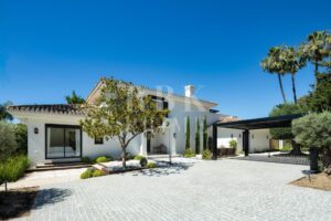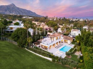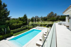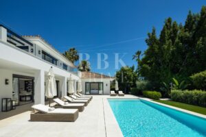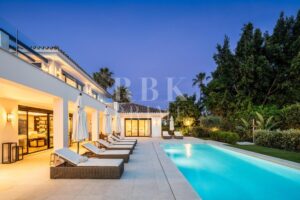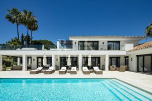 Elegante villa moderna en venta en Nueva Andalucía, Málaga, ubicada en primera línea de golf en una de las zonas más exclusivas de Marbella, que combina elementos arquitectónicos atemporales con interiores contemporáneos y refinados. Recientemente renovada con los más altos estándares, la propiedad se asienta sobre una parcela de 1.561 m² y ofrece 490 m² con amplias zonas de estar de concepto abierto y 5 dormitorios en suite. El dormitorio principal cuenta con acceso directo a una terraza con vistas panorámicas, amplios armarios y un baño de lujo. Grandes ventanales y puertas correderas maximizan la luz natural y conectan los interiores con las amplias terrazas exteriores. En el exterior hay una entrada impactante con aparcamiento cubierto para dos vehículos, una gran piscina, una zona de descanso hundida y espacios dedicados para comer y relajarse al aire libre. La planta inferior alberga un gimnasio totalmente equipado y una zona de ocio con un bar a medida, ideal para disfrutar con la familia y los amigos. Situada en el corazón del Valle del Golf, la propiedad está cerca de prestigiosos campos de golf, Puerto Banús y una amplia gama de servicios. Se trata de una oportunidad única de adquirir una residencia excepcional en uno de los lugares más cotizados de Marbella.