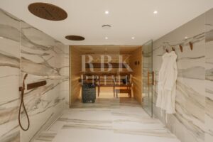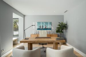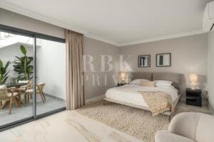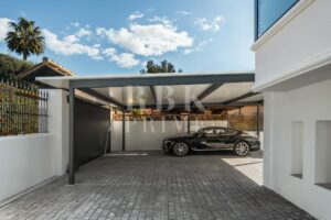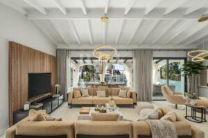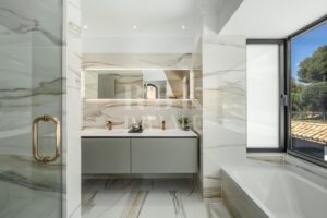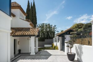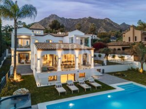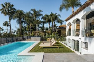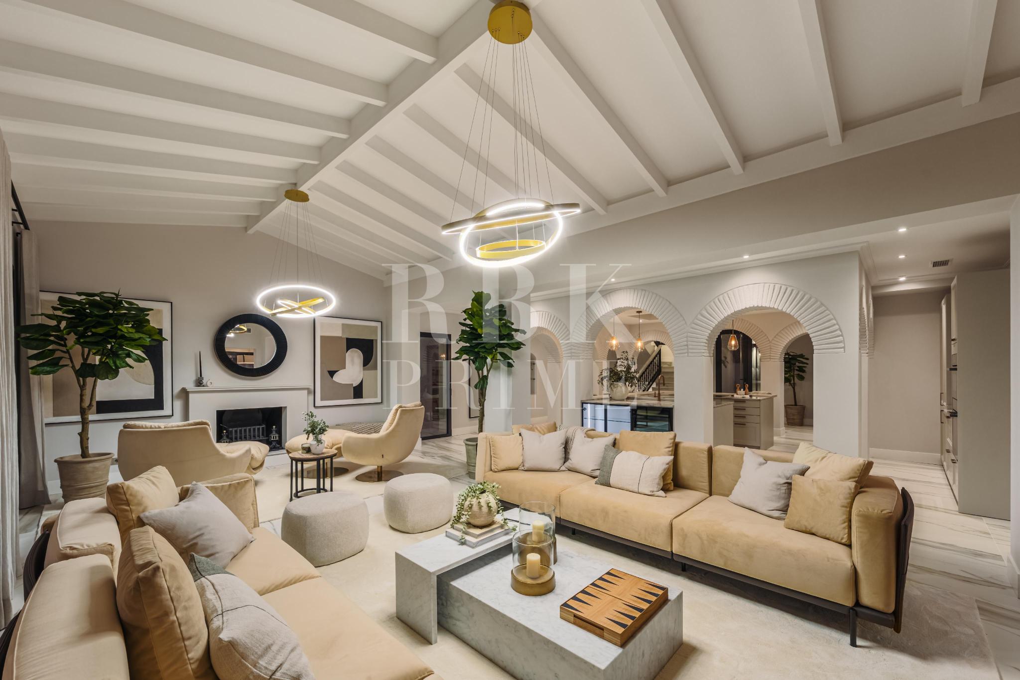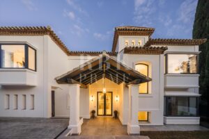 Elegante villa de estilo mediterráneo en venta, ubicada dentro de una comunidad cerrada en la prestigiosa Milla de Oro de Marbella. Situada en una parcela de 1.029 m², la propiedad ofrece 461 m² construidos en un entorno tranquilo, a solo minutos de la playa, colegios internacionales, campos de golf y el centro de la ciudad. La villa dispone de 5 amplios dormitorios en suite, incluida una lujosa suite principal con acceso a una terraza privada y 2 aseos para invitados. El interior combina el carácter andaluz con un diseño contemporáneo, e incorpora arcos, techos altos con vigas blancas vistas y una paleta de colores neutros que crean un ambiente sereno y elegante. Las zonas de estar y comedor de planta abierta son luminosas y acogedoras, y la cocina está totalmente equipada cuenta con electrodomésticos de alta gama y una isla central ideal para comidas informales. La planta inferior alberga una amplia sala polivalente, 2 dormitorios adicionales, un spa, un gimnasio y una sala de cine. En el exterior, la villa ofrece jardines paisajísticos, una piscina privada, jacuzzi al aire libre, varias terrazas y una zona de barbacoa perfecta para disfrutar al aire libre. Con orientación sureste, espacio para 4 vehículos y total privacidad, esta propiedad se encuentra en una de las zonas residenciales más exclusivas de Marbella...