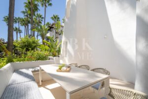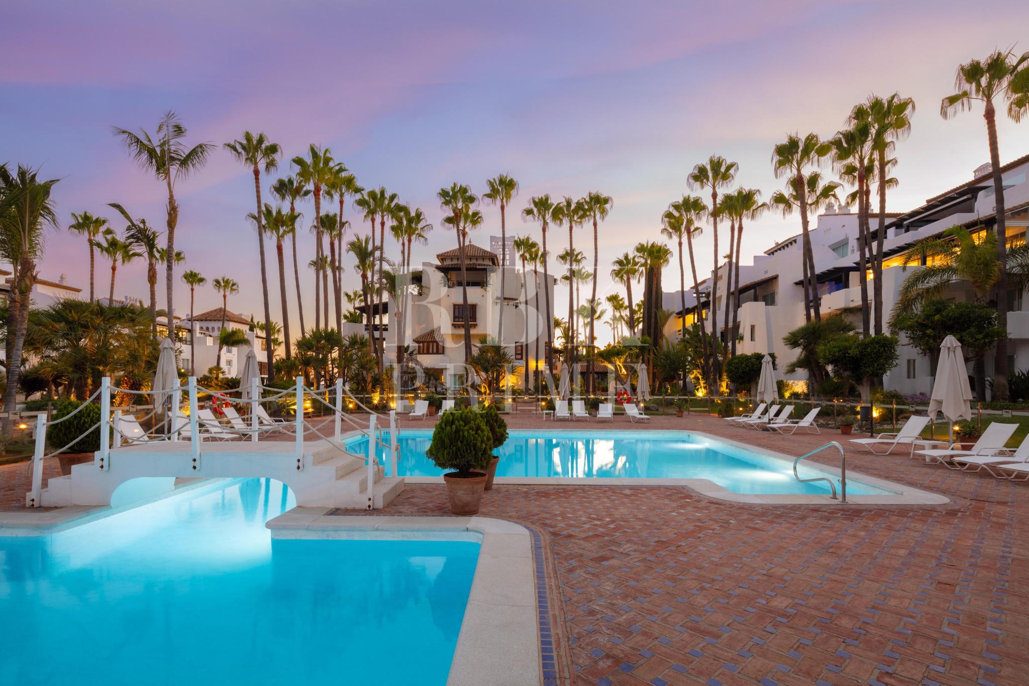 位于马贝拉黄金一英里著名海滨街区的优雅公寓。这座设计精美的单层住宅建筑面积约 152 平方米,体现了地中海生活方式的精髓。住宅有三间卧室,每间卧室都配有浴室,主卧室还拥有一个宽敞的露台。公寓将室内外空间无缝连接。落地推拉门将露台与开放式客厅/餐厅和厨房相连,营造出明亮通风的氛围。舒适的餐厅毗邻时尚的现代化厨房,厨房拥有充足的储物空间和现代化的电器,为公寓增添了迷人的氛围,而吧台区与之相得益彰。其他设施还包括地暖、空调、最先进的 KNX 家庭自动化系统和集成音响系统。这套公寓距离海滩和综合大楼仅几步之遥,在马贝拉最热门的地区之一提供了尊贵的生活方式。